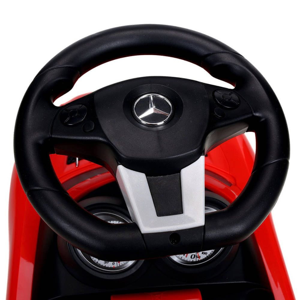 Mali Mercedes imavrtljiva kolesatako da se lahko vaš malček počuti kot v pravem avtomobilu. Kolesa so čvrsta, torejni vam treba skrbeti, da bi se prevrnili.Kolesa s premerom 13,5 cm in širino 6 cm zagotavljajo varnost vašega malčka. Lažni zavorni koluti dajejo avtomobilu resnično realističen videz. Dodatna prednost jeudoben sedež z naslonjalom. Zahvaljujoč temu se lahko vaš malček več ur pretvarja, da je voznik.