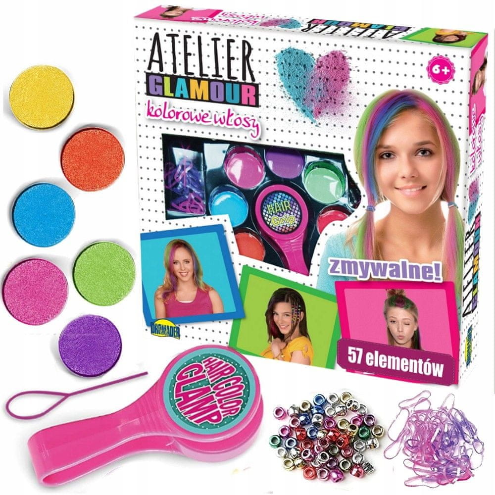 Komplet za okraševanje in barvanje las. Nanesena barva se enostavno spere. Poleg ustvarjanja pisanih pramenov lahko pričesko tudi okrasite s priloženimi dodatki (58 kosov). Vse je pakirano v okencu z grafiko. Komplet vsebuje: