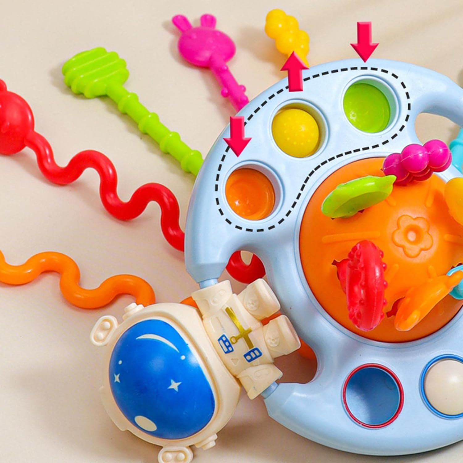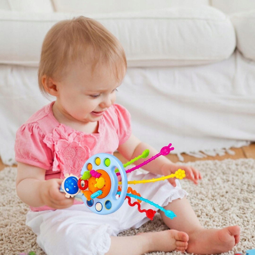 Grizalo ima šest teksturiranih vrvic, ki ob potegu skozi luknjice oddajajo različne zvoke in vibracije. Vrvice imajo različne konce, kar pomaga razvijati oprijem in fino motoriko.