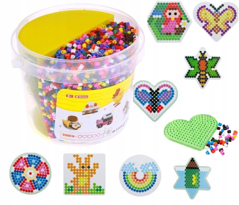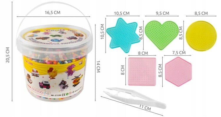 Sprostite svojo ustvarjalnost in ustvarite svoje pisane vzorce tako, da razporedite kroglice po šablonah. Likalne kroglice lahko uporabite za okrasitev sobe, izdelavo obeskov za ključe, obeskov ali ustvarjanje slik. Za ustvarjanje nakita, ogrlic in zapestnic nanizajte kroglice na vrvico. Ta komplet razvija otrokove fine motorične sposobnosti in koordinacijo. Otroci lahko z njimi ustvarijo pisane like, vozila in figure, edina omejitev pa je njihova domišljija.