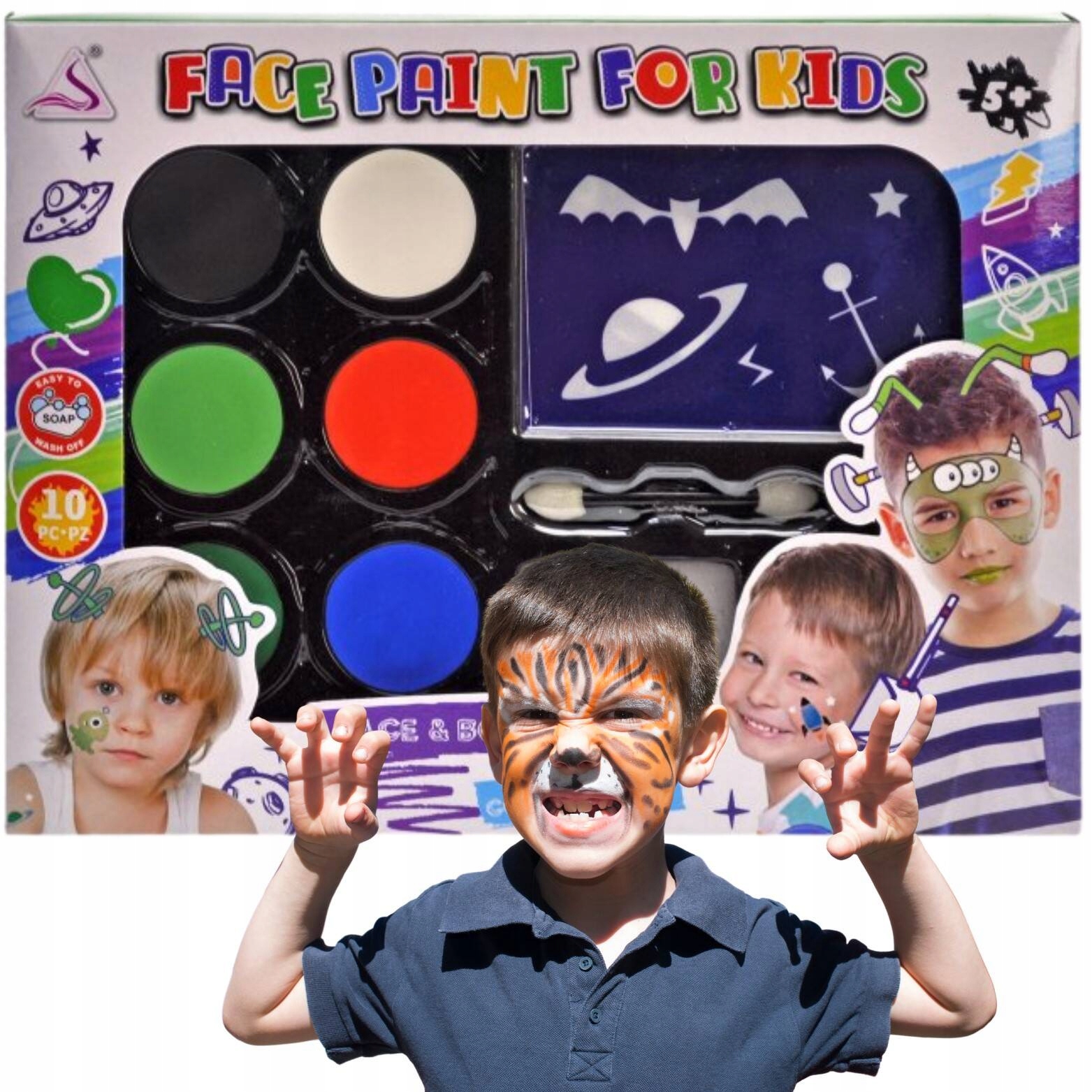 je popoln za šolske zabave, noč čarovnic ali izlete . Med šablonami boste našli različne oblike, vključno z netopirjem, zvezdo, planetom, sidrom in številnimi drugimi zanimivimi motivi. Komplet za poslikavo obraza je ustvarjalna igrača