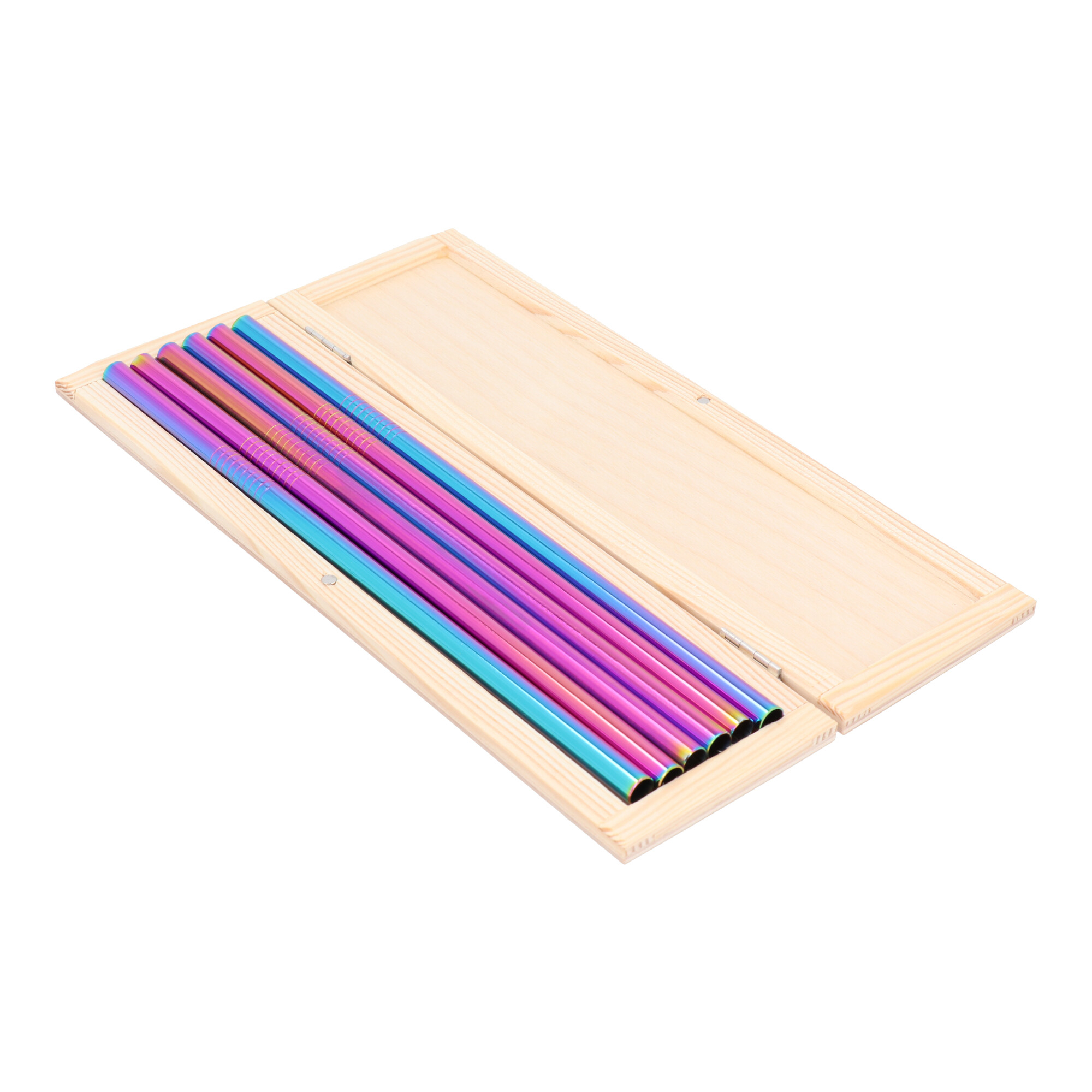 Komplet 6 debelejših jeklenih slamic v lesenem ohišju mavrične barve