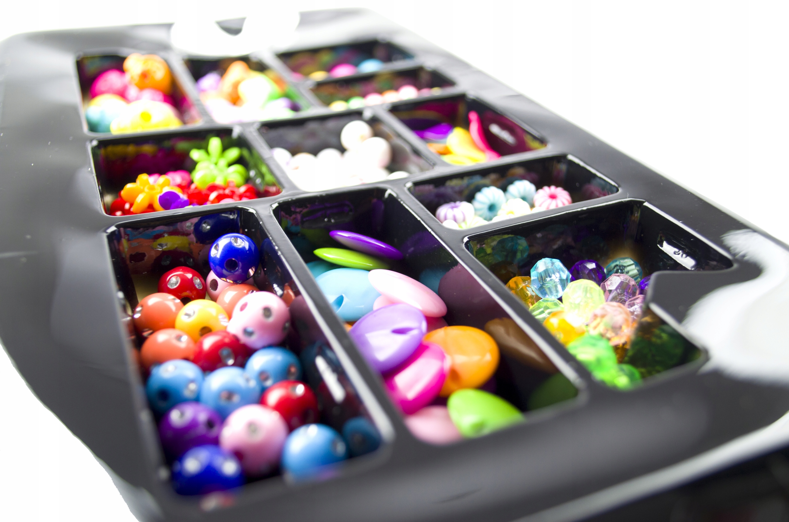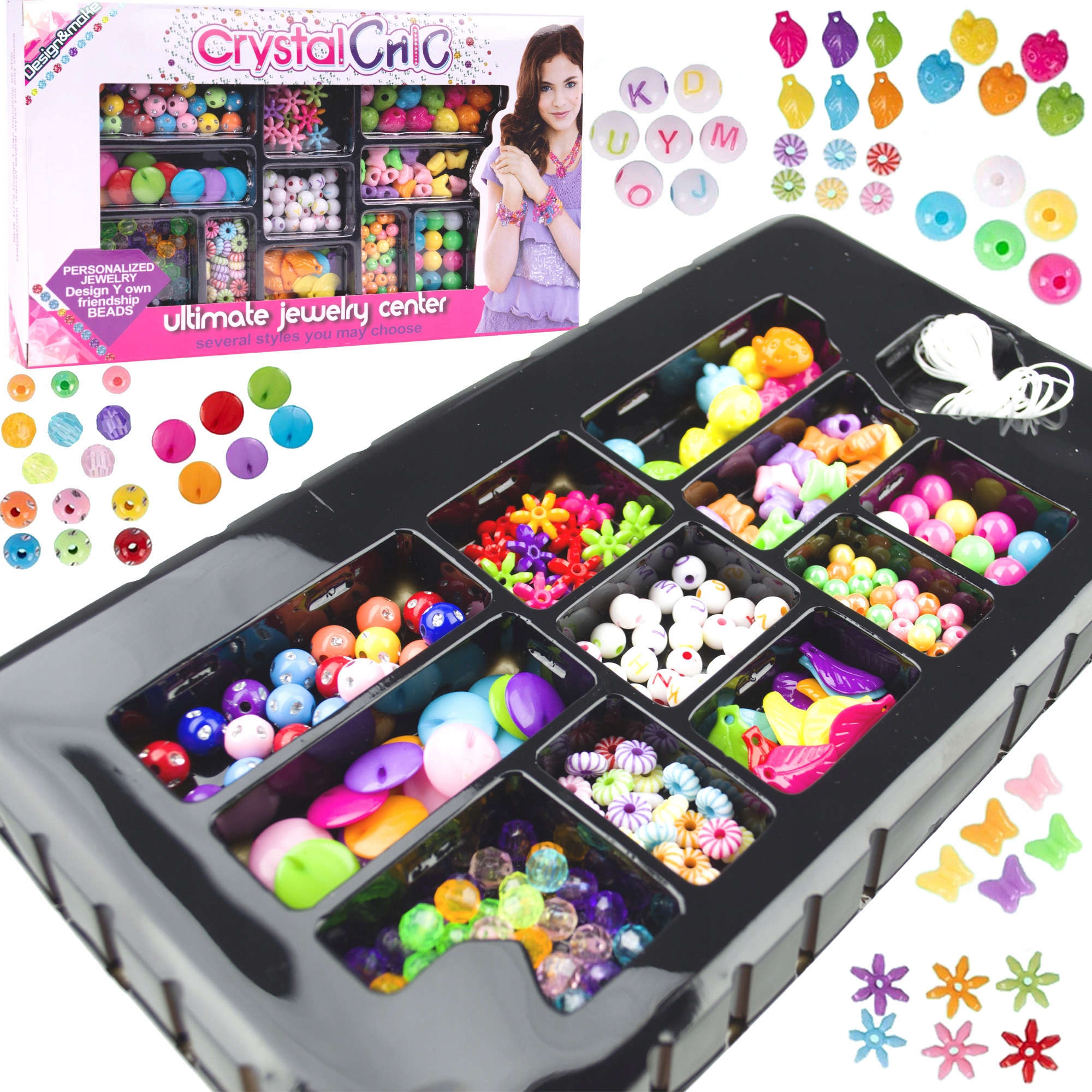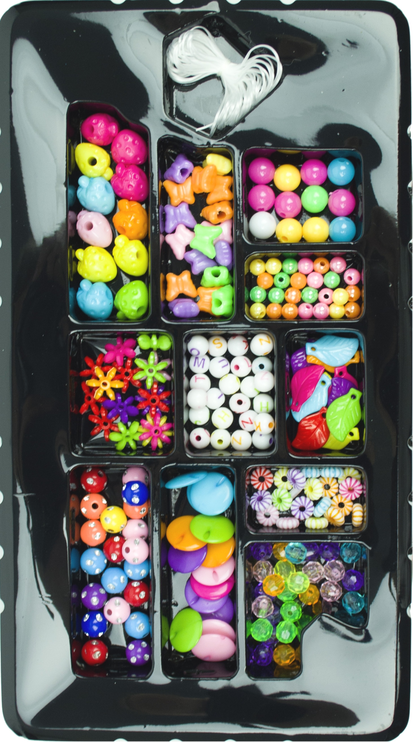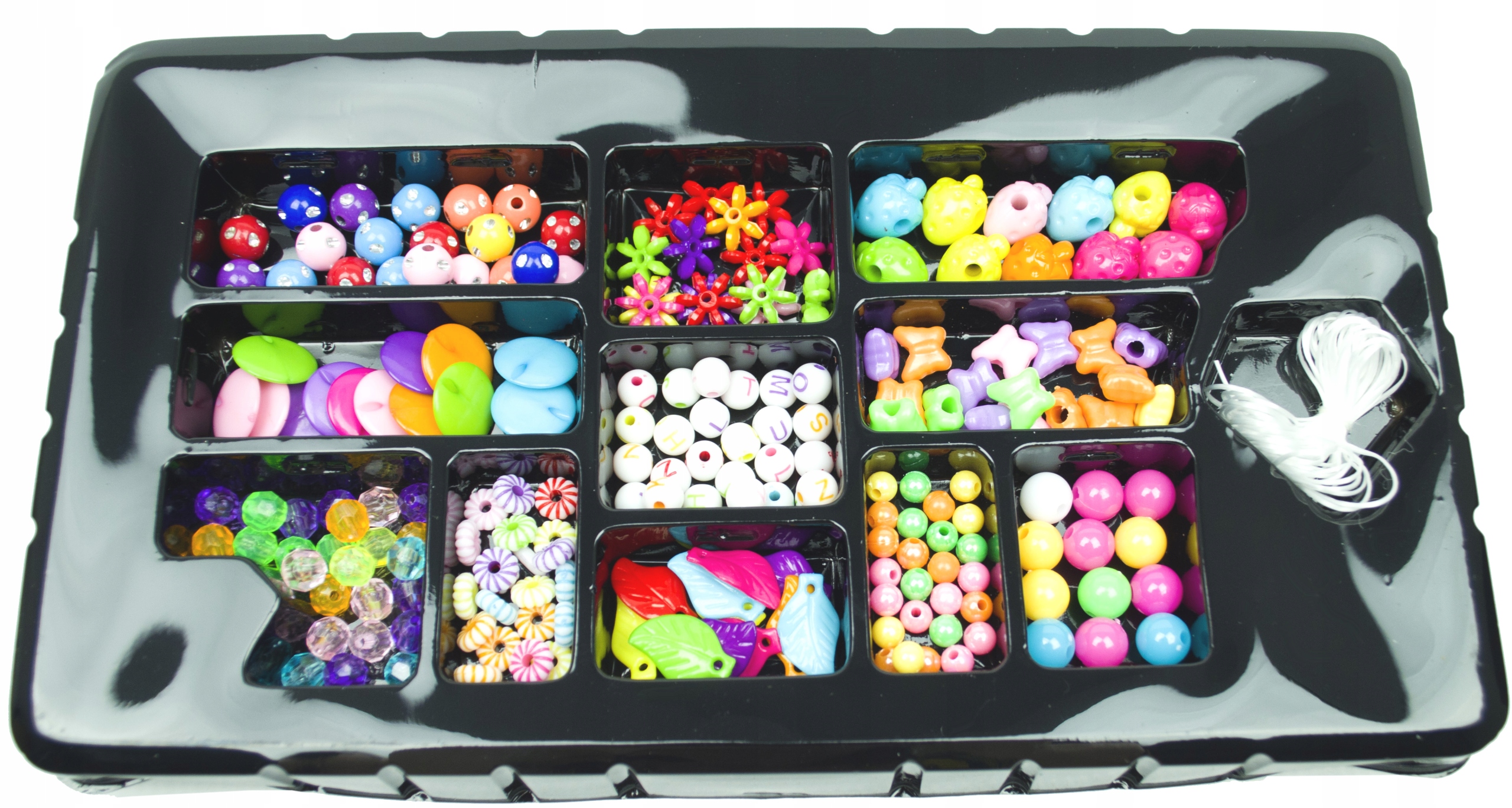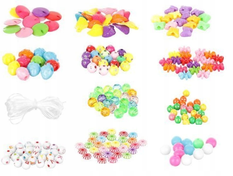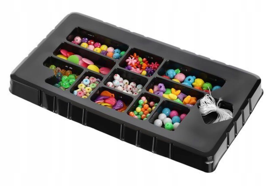 Kroglice so razvrščene po vrsti in se prilegajo plastičnim predalčkom embalaži, kar olajša transport in zmanjša možnost izgube elementov. Če želite ustvariti zapestnico ali ogrlico , preprosto nanizati perlice na vrvico , ki je priložena kompletu, nato pa jo zavežite v vozel . Komplet vsebuje 11 različnih vrst perlic , večjih in manjših, različnih oblik in barv, ter vrvico . KONTRASTNE BARVE