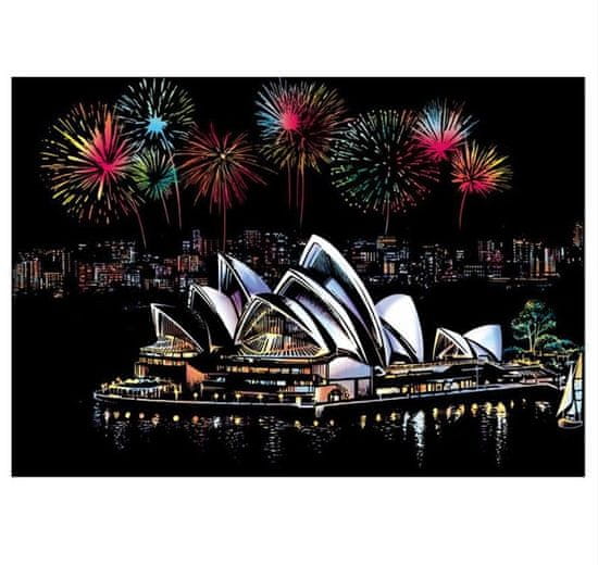 Skrita slika prikazuje najbolj ikoničen simbol Avstralije – operno hišo v Sydneyju. Opera spominja na valovita jadra, ki se neopazno zlijejo z okoliško vodo in mestno pokrajino. Spraskajte in razkrijte nočno panoramo Sydneyja, osvetljenega z ognjemetom.