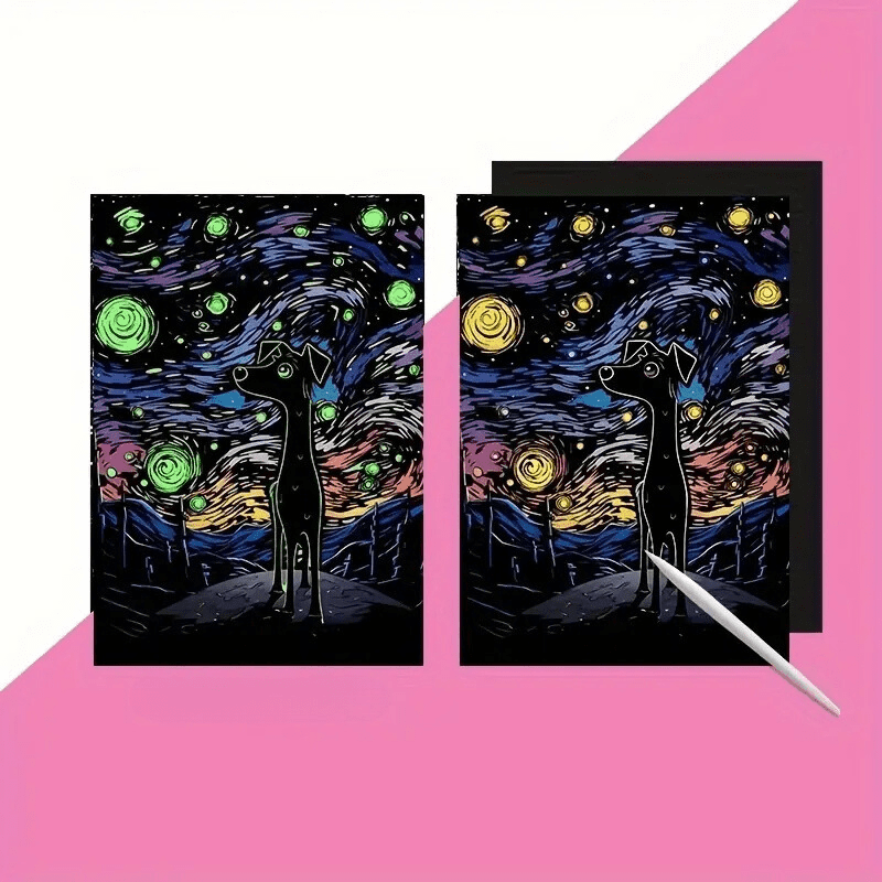 Odkrijte čar nočnega neba s to fluorescenčno sliko, ki prikazuje očarljivega psa, ki tava med zvezdami. Preprosto obrišite zgornji sloj, da razkrijete celotno barvo in se čudite, ko se slika sveti v temi!