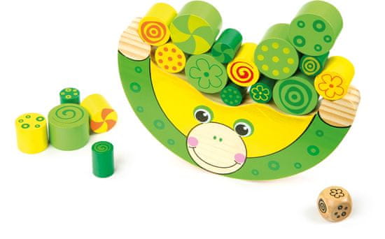 Drevesna igra, pri kateri otroci vadijo fino motoriko, sklepanje, logično razmišljanje in potrpežljivost. Igra je namenjena 1–4 igralceme. Velikost se natančno prilega majhnim rokam in omogoča ure in ure ustvarjalne zabavebavy. Pravila igre:Postavi žabo na ravno površino. Ponovno vrzi kocko in postavi še en barvni valjček. Poskrbi, da bo žabica ohranila ravnotežje in se ne bo prevrnila. Igro nadaljuj, dokler ne postaviš zadnjega barvnega valja. Če žaba izgubi ravnotežje in valjčki padejo, začnite od začetka tku.2 do 4 igralcev. Igralec, katerega valjček pade, je izločen iz igre. Ostali igralci nadaljujejo igro. Glavne značilnosti: izdelan iz lesarazvija motorične sposobnosti