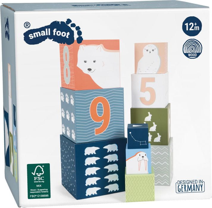 Z desetimi kockami za zlaganje iz trpežnega kartona s certifikatom FSC v obliki arktične pokrajine lahko mali graditelji preizkusijo svoje sposobnosti zlaganja in na igriv način odkrivajo živali arktičnega kroga. Na vsaki kocki je natisnjena ustrezna serijska številka, ki ustreza številu števnih motivov. Ti vključujejo prikupne portrete znanih polarnih živali na eni strani in sledi, ki jih te živali puščajo v snegu, na drugi strani. Oblikovanje kock dopolnjujejo abstraktni vzorci, ki temeljijo na arktičnem okolju. Na vrhu vsake kocke je „polarna zvezda“ s številom izboklin, ki ustreza posamezni kocki. Svet, poln številk, živali in pustolovščin! „Arktične“ kocke za zlaganje niso le sodobno oblikovane, temveč ponujajo tudi igriv in posebej nazoren način za vadbo štetja ter razvijanje razumevanja števil in količin. Zaradi svoje zasnove prinašajo pustolovščino in učenje v vsako otroško sobo. Z razvrščanjem in zlaganjem arktičnih kock tudi najmlajši vadijo motorične spretnosti, koncentracijo in spretnost, hkrati pa razvijajo razumevanje barv in velikosti. Ko je igre konec, lahko kocke potisnete eno v drugo in jih shranite, da prihraniteprostor.Linijamotoričnihigrač „Arctic“ je posvečena šestim živalskim prijateljem in njihovemu življenju v mrzlem arktičnem okolju: veličastnemu polarnemu medvedu, igrivemu mrožu, radovednemu tjulnju, okretnemu polarnemu zajcu, modri snežni sovi in zviti arktični lisici. Vsi prebivalci Arktike nosijo značilna bela zimska oblačila in so še posebej priljubljeni kot različice klasičnih otroških motivov, kot so medved, zajec, lisica, sova in tjulenj. Glavne značilnosti: bloki s certifikatom FSC omogočajo začetno razumevanje živali, številk, barv in velikostibloke je mogoče potisniti enega v drugega in jih shraniti, da prihranite prostors ljubkimi motivi arktičnih živalištevilke od 1 do 10 in portreti živali