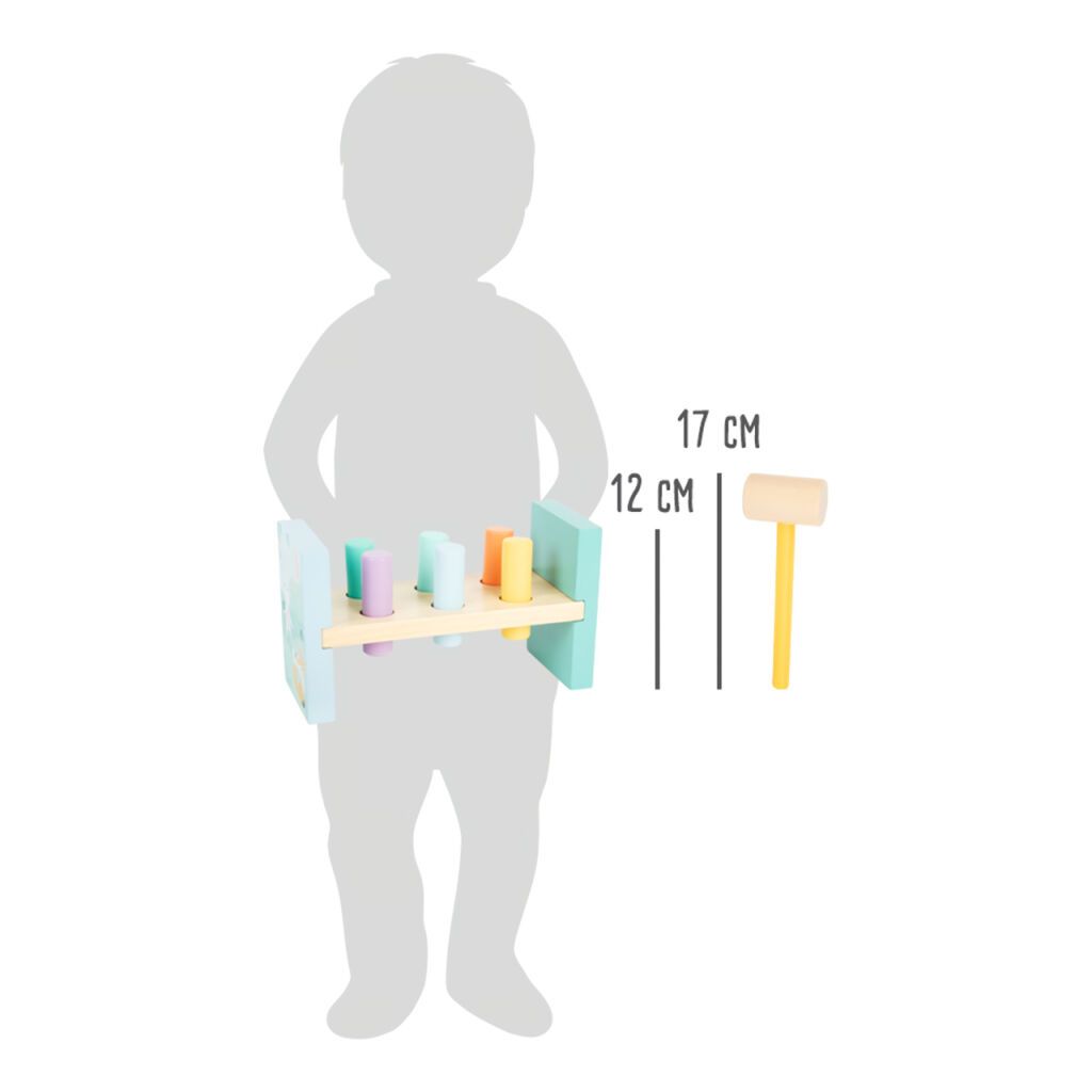 Tudi udarjanje s kladivom je lahko elegantno! Z igračo v pastelnih barvah lahko otroci merijo svojo moč. Gre za klasično igro, s katero otroci trenirajo koordinacijo rok in oči ter motorične spretnosti. Igrača s kladivom ima čudovite barve in ilustracijo živali. Ko so zabiti vsi žebljički, igračo preprosto obrnite. Čudovita igrača za zabijanje je del serije izdelkov „Pastel“ in navdušuje z visoko vsebnostjo vidnega lesa ter sodobnimi barvami v pastelnih barvah.Glavneznačilnosti: ilustrirane, nežne pastelne barve robustna in trpežna zasnova