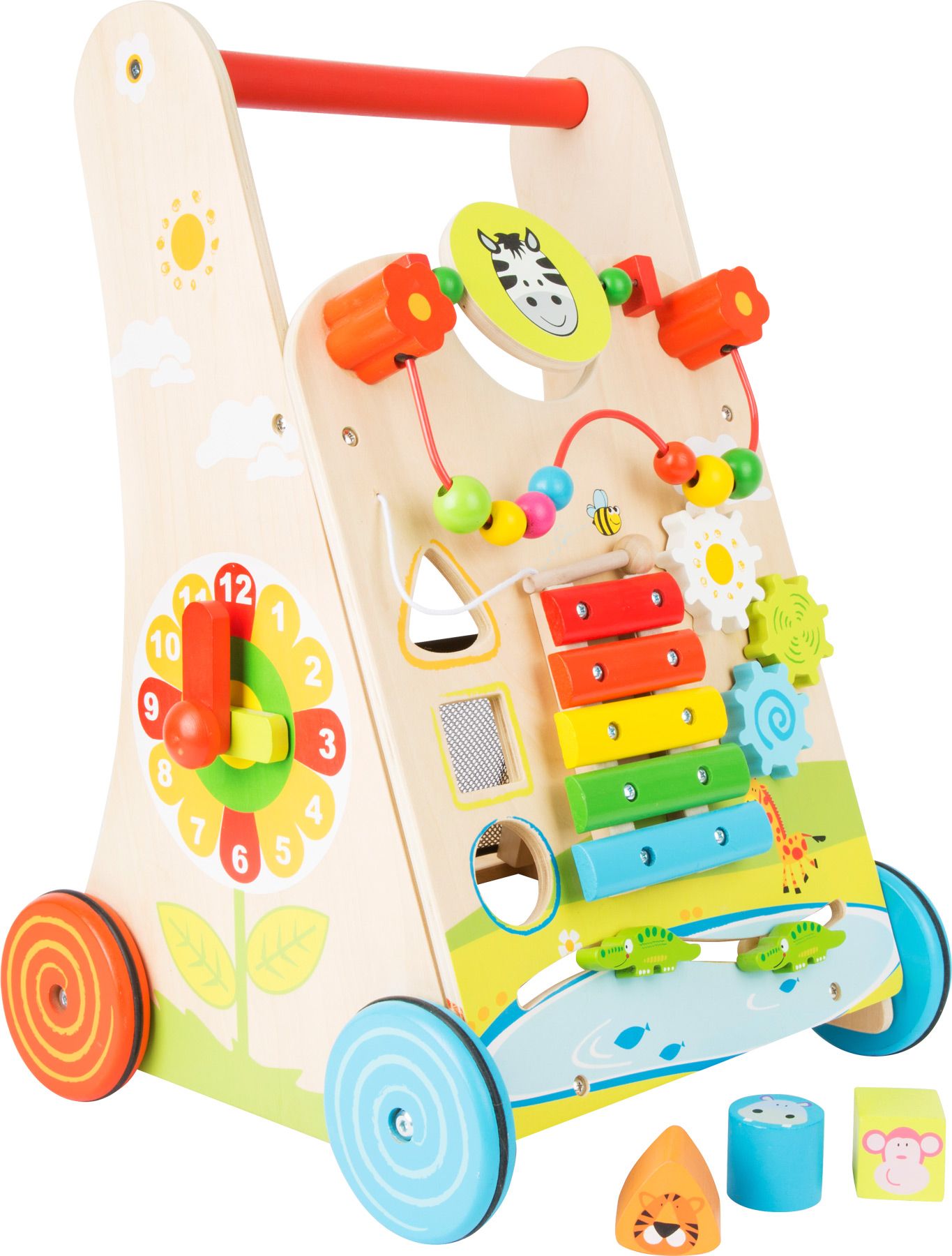 Aktivno z vseh strani! Ta stabilna otroška hojica ponuja vse, kar mali raziskovalci potrebujejo za odkrivanje sveta z vsemi čutili. Na hodulji boste našli številne interaktivne elemente, kot so ksilofon s 5 tipkami, ura, labirint, sestavljanka, škatla za vstavljanje z oblikovanimi kockami. Spodnji del hodulje se lahko uporablja kot prostor za shranjevanje ali za prenašanje plišastega blaga. Kolesa imajo gumijast trak za tiho vožnjo po gladkih tleh. Čudovit pripomoček za prve korake. Glavne značilnosti: večnamenskostzmogljiv ročajbarvna kolesa