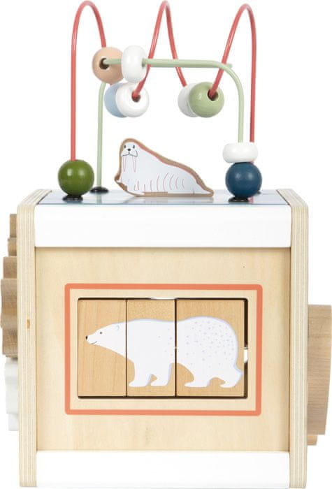 Motorična zabava s polarnim zajcem, polarnim medvedom, tjulnjem in njihovimi prijatelji. Ta motorična kocka je izdelana iz 100-odstotno certificiranega lesa FSC. Na petih igralnih straneh ponuja veliko možnosti za raziskovanje. Na primer dva labirinta s kroglicami, vstavljanje oblik, drsni labirint, vrtenje ploščic ali zobatih koles. To otrokom zagotavlja dolgotrajno zabavo in raznolike priložnosti za učenje. Na vsaki strani kocke male raziskovalce spremljajo tjulenj, mrož, polarni medved in druge arktične živali, ki na zabaven način spodbujajo radovednost. Motorična kocka ima snemljiv pokrov, tako da lahko živali ali oblike, ki jih otrok trenutno ne uporablja, vstavite v kocko. obračanje, vstavljanje, drsenje, vrtenje, raziskovanje spodbuja domišljijo, hkrati pa trenira spretnost, fino motoriko ter prepoznavanje barv in oblik, hkrati pa uči načelo vzroka in posledice. Ta kocka je s svojimi sodobnimi barvami, veliko količino lesenega materiala in arktičnimi vzorci prava paša za oči v otroški sobi. Ima zaobljene robove za prijetno haptičnoizkušnjo. Glavneznačilnosti: razvija motorične sposobnosti, senzorične funkcije, prepoznavanje barv in oblik100 % lesa FSCsodoben izviren dizajnzaobljeni roboviZnak in certifikat FSC (Forest Stewardship Council) zagotavljata, da les, iz katerega je izdelek narejen, ni bil nezakonito posekan in prihaja iz gozdov, s katerimi se upravlja na trajnosten ali naravi prijazen način, pri čemer se spoštujejo stroge okoljske in socialne zahteve. Oznaka FSC na izdelku pomeni, da z nakupom prispevate k varstvu gozdov in podpirate trajnostno, odgovorno ali naravi prijazno gospodarjenje, zaradi katerega so naši gozdovi stabilnejši, bolj zdravi, z naravno sestavo vrst in bolje kljubujejo negativnim učinkom podnebnih sprememb.