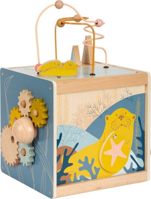 Vsestranska lesena kocka za gibalne dejavnosti z dvema labirintoma s kroglicami, gumijastimi drevesi za oprijemanje in drsnim labirintom na pokrovu. Igra z zobatim kolesom s štirimi odstranljivimi zvezdicami in meduzo, ki je mehka na otip, se lahko uporablja za ujemanje oblik. Drugi drsni labirint ter več ogledal in majhnih loput spodbuja otroke k preizkušanju, raziskovanju in čudenju. Snemljiv pokrov je mogoče shraniti v kocko in tako prihraniti prostor pri shranjevanju. Motorična kocka naredi odličen vtis zaradi kombinacije veliko naravnega lesa in nežnih, modnih barv, zaradi zaobljenih robov pa ponuja prijeten haptični vtis. Glavne značilnosti: 5 igralnih površinv notranjosti kocke je dodaten prostor za shranjevanjekakovostne ilustracije v modnih barvah med igro, učenjem in odkrivanjem razvija zaznavanje, spretnost in fino motoriko