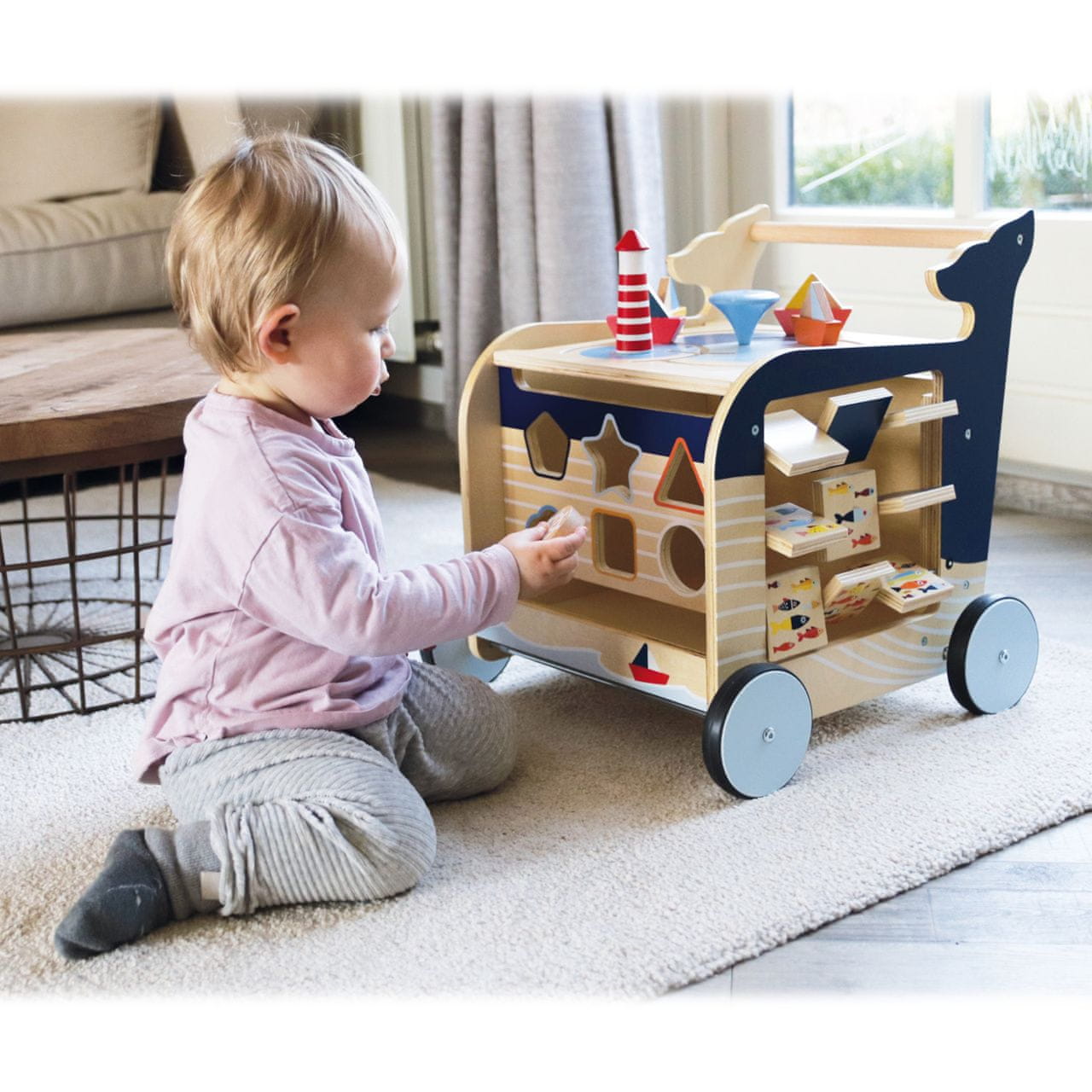 Pojdimo raziskovat s kitom! Ta lesena hojica v obliki kita bo otrokom pomagala pri prvih korakih, hkrati pa bo ponujala igrače za razvijanje motoričnih spretnosti. Hodulja sledi slogu morskega sveta in njegovih živali. Na štirih straneh hodulje so igre, kot so vstavljanje oblik, vrtenje slik ali risalna tabla. Otroci se lahko naučijo šteti, prepoznavati svetovne strani ali razlikovati letne čase. Hodulja ima gumirana kolesa, zato je tiha in varna. Hodulja se odpira na vrhu, vrata pa imajo ključavnico s prstom. Zato lahko vanj shranite vse kocke. Na voljo je tudi zavorni sistem, ki preprečuje nesreče. Glavne značilnosti: večnamenska igračaspodbuja igrivost in motorični razvoj