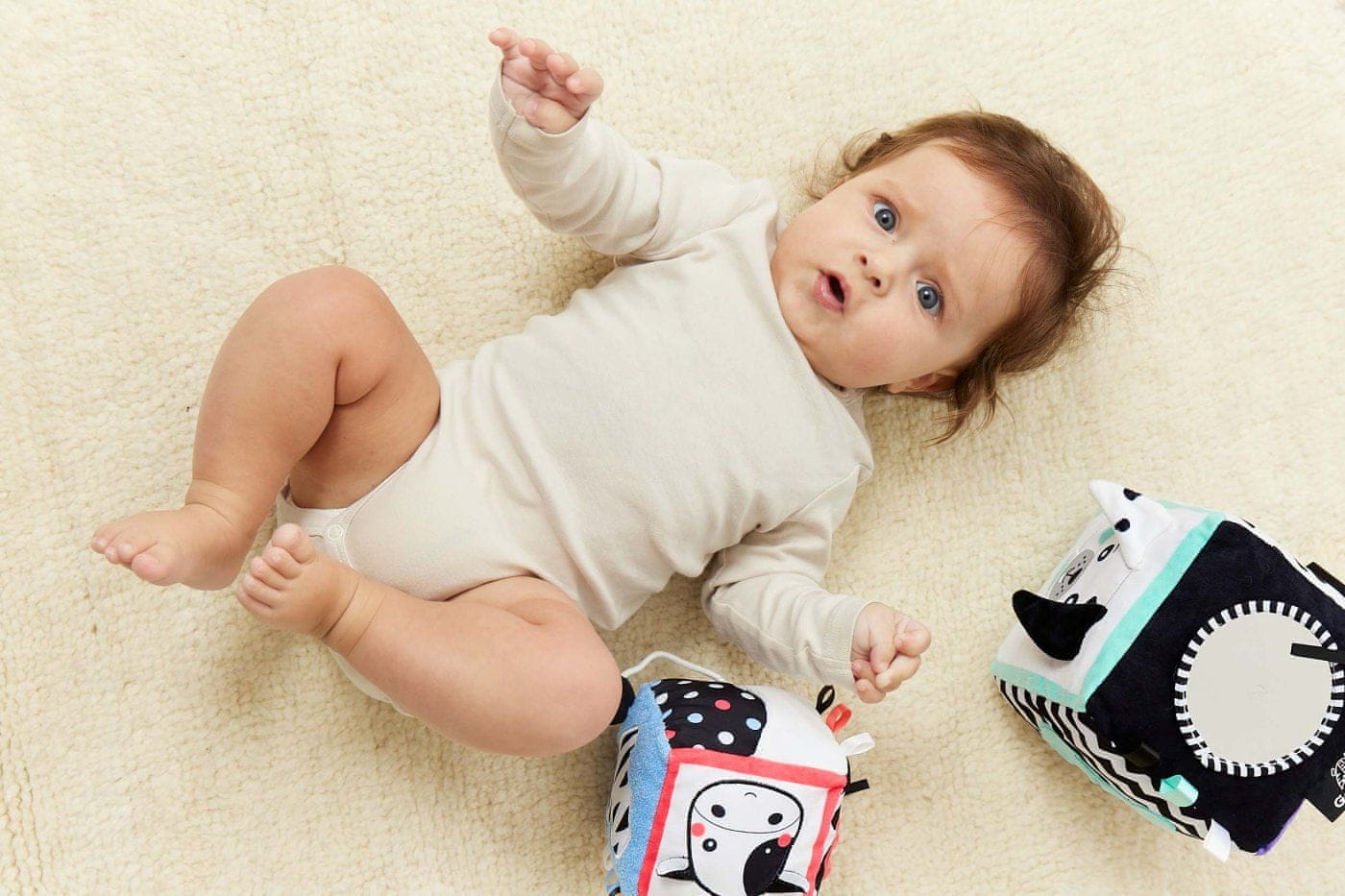 Ne glede na to, kako nadarjen je vaš otrok, je prezgodaj za igranje z Rubikovo kocko. Za dojenčke od 3 mesecev naprej priporočamo plišasto senzorično kocko s slikama prijazne krave in razposajenega tigra. Kocka GaGaGu ima kontrastne barve in vzorce, ki spodbujajo dojenčkov vid. Vsaka stran kocke je popolnoma drugačna, izdelana iz različnih materialov (z različnimi teksturami), kar omogoča 6 popolnoma različnih senzoričnih izkušenj – vizualnih in taktilnih. Dve stranici kocke imata štrleče živalske elemente – kravja ušesa, tigrov rep – otrok spoznava različne teksture materialov, lahko zagrabi štrleče elemente in vadi fino motoriko. Na drugi strani iz pliša je žepek s plišasto žogico na vrvici – element spodbuja otroke, da zgrabijo žogico ter jo vstavijo in odstranijo iz žepka – to spodbuja t. i. fino motoriko in učenje motorične koordinacije. Na drugi plišasti strani je ogledalo, ki pritegne otrokovo pozornost in ga spodbuja, da zgrabi kocko in spoznava svoj odsev. Na drugi strani so prišiti dodatni trakovi, ki prav tako spodbujajo fino motoriko. Starost 3m+