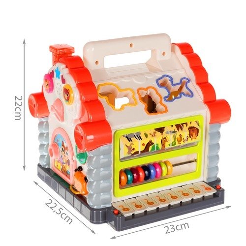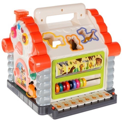 • SORTER, LUČKE IN IGRA – interaktivna hiša ima na strehi in na drugi steni razdelilnik oblik . Razvrščevalniku so priložene pisane kocke v 5 oblikah in 6 živali z ropotuljico v notranjosti. Da lahko kocke pristanejo v hiši, mora malček ustrezno kocko uskladiti z luknjo. Med igro s to edinstveno hišo bo otrok spremljal ob utripajočem dimniku in prijetnih melodijah bo zabava zagotovo še bolj prijetna. Če želite zaigrati pesem, samo pritisnite eno od tipk na orglah. Medtem ko se v ozadju predvaja ena izmed pesmi, se bo na konici igrače zasvetila lučka, ki bo zagotovo zanimala vsakega otroka. Poleg tega lahko vključite glasbo ali klavir.