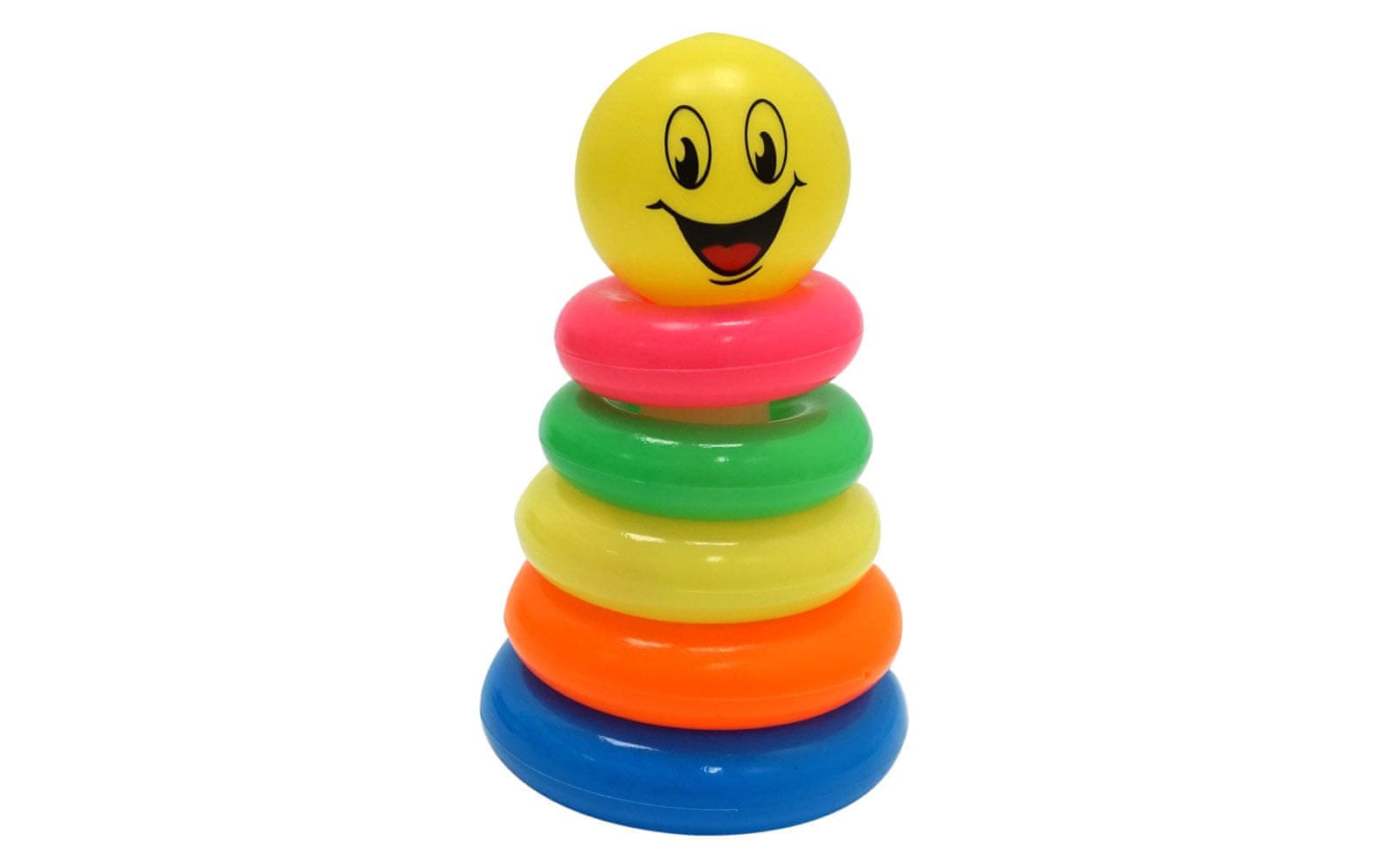 Barviti okrogli obroči položeni drug na drugega v obliki piramide, ki se zaključi s simpatično rumeno račko ali figurico nagajivega nasmeha na obrazu.