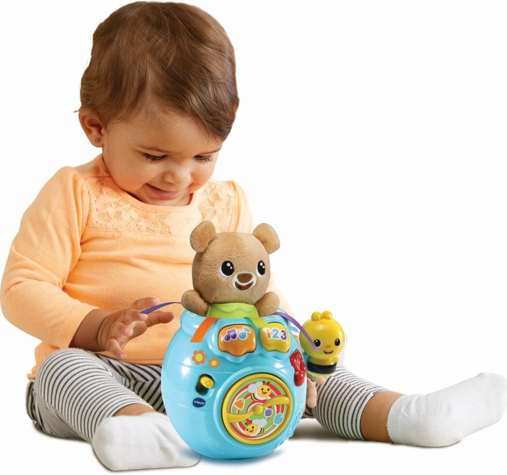 Vtech Medvedek, skrij se! je legendarna glasbena in izobraževalna igrača za otroke, stare že 6 mesecev. S prikupnimi frazami interaktivno komunicira z otrokom. Če medvedka nežno potisnete v posodo, se medvedek skrije. Z naslednjim pritiskom na gumb medvedek „pokuka“ iz lončka. Vse to spremljajo zabavne fraze, pesmice in melodije. Premikajoča se čebela na strani lončka z medom lahko zavrti tudi propeler na sprednji strani lončka. Igrača otroke na nenasilen način uči tudi pesmi, prepoznavanja številk in širjenja besednega zaklada. Potiskanje medvedka, njegovo premikanje in tudi, na primer, vrtenje propelerja pomaga razvijati fino motoriko. Predvaja 15 melodij in poje 3 pesmi