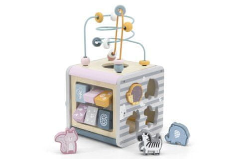 Drevesna škatla za dejavnosti 5v1. Vključuje sestavljanko, labirint, zobata kolesa in vrtljive elemente. Dimenzije približno 18 × 18 × 31,5 cm. Dimenzije približno 20,5 × 32,5 × 19 cm. Starost 24m+