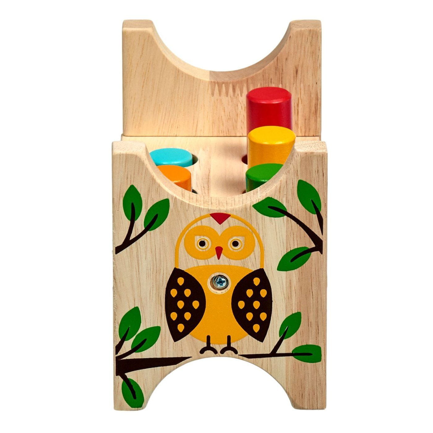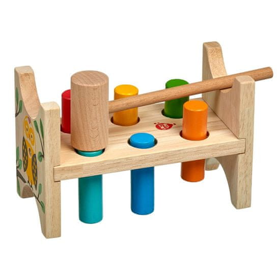 Gozdna sova je klasično leseno kladivo s pisano in veselo sliko za dečke in deklice. Ima leseno ploščo s šestimi luknjami in kladivo za vadbo zabijanja šestih barvnih zatičev. Ko so zabiti vsi žebljički, se stojalo obrne in zabijanje se lahko začne znova. Igrača služi za razvijanje fine motorike, koncentracije in predvsem koordinacije gibanja. Dimenzije stojala 13,8 × 8,5 × 9,3 cm.