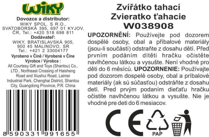 Pet pulling. Velikost 12 cm. Žival je na kolesih. Z vlečenjem vrvice gre žival naprej in premika kroglice na hrbtu. 3 različice – zajec, slon, pes.
