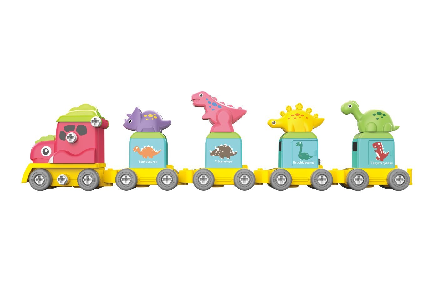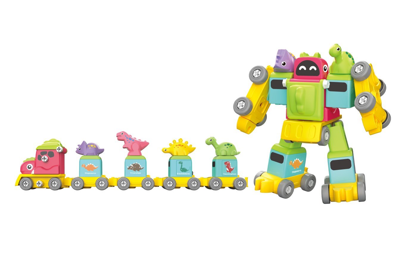 Robotski dino vlak vijak. Paket vsebuje razstavljen vlak s 4 vagoni, navodila za sestavljanje vlaka in robota ter izvijač. Vlak lahko sestavite s 4 vagoni ali enim robotom.