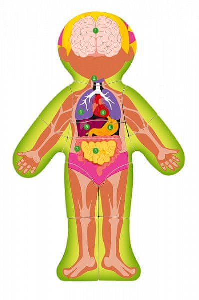 Lesena sestavljanka z motivom človeškega telesa. Izobraževalna sestavljanka, ki predstavlja zgradbo človeškega telesa in človeške organe. Dvanajstdelna sestavljanka z deklico, ki ima na hrbtni strani vsakega dela označene človeške organe. Koščki so vstavljeni v sliko v ozadju, ki prikazuje zgradbo človeškega okostja. Slika v ozadju prikazuje tudi številčni seznam organov in človeških kosti. Primerno za otroke, stare 3 leta in več. Opomba: Sestavljanka vsebuje navodila za vsak organ in kost v angleščini.