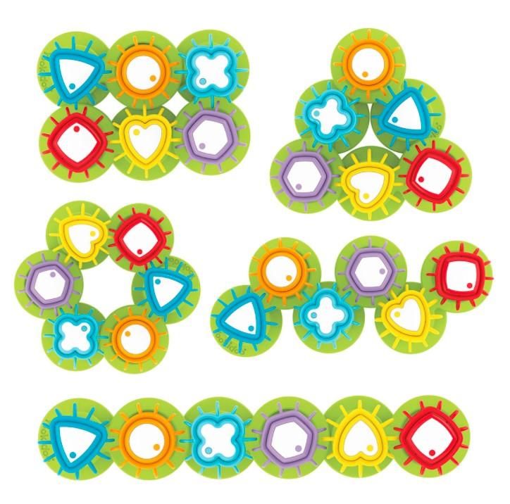 Inovativna igrača, ki otroke uči barv in oblik. Zobate oblike so nameščene na prilagodljivi podlagi, ki jo je mogoče oblikovati in preoblikovati v različne vzorce. Ne glede na postavitev podlage se zobate oblike vedno vrtijo.