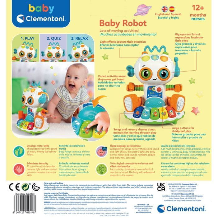 Clementoni Baby Robot je zabaven motoriziran robot s številnimi elektronskimi in mehanskimi dejavnostmi, ki majhnim otrokom omogočajo razvoj fine motorike, logičnega razmišljanja in koordinacije gibanja. S svojim najnovejšim malim prijateljem se boste odlično zabavali. Ko premaknete ročico na njegovi glavi, robot spremeni svoj „izraz obraza“ in način igranja. Na voljo so 3 načini igre, izobraževanje, kviz in spanje, vsak z ločenimi funkcijami za zabavo! Pritisnite gumbe in se naučite imen živali, barv in številnih novih besed. Z izbiro načina kviza bo otroški robot predstavil preproste uganke, ki jih je treba rešiti, kar bo otrokom pomagalo razviti njihove kognitivne sposobnosti. V izobraževalnem načinu in načinu kviza se Clementoni baby robot premika, predvaja melodije in pesmice ter tako pritegne pozornost otrok. V načinu spanja je gibanje robota deaktivirano, otroke pa zabava s pesmicami in rimami. Številne funkcije spremljajo zabavni svetlobni učinki. Robot deluje na 3 x AA baterije, ki so priložene samo za predstavitvene namene. Jezikovne različice: CZ/SK/HU. Dimenzije paketa: 32 × 30 × 20 cm. Starost: 12 m+