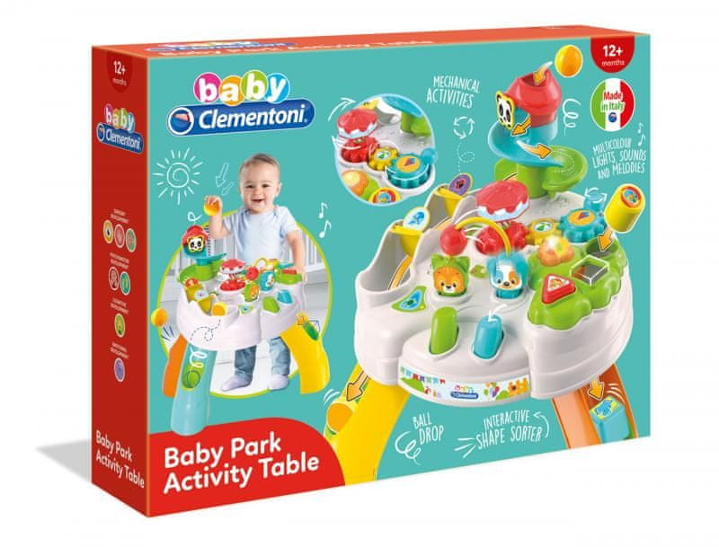 Vesela otroška igralna miza Clemmy z bloki in živalmi bo vaše otroke zabavala dolgo časa. Igralna miza s številnimi dejavnostmi, namenjenimispodbujanju interakcije z otrokom. Vstavljive oblike z lučkami in zvoki, vrtljivi zobniki in gumbi za upravljanje psa in mačke. Miza vključuje zabavno stezo z žogo z veliko neverjetnimi tobogani in ovirami. Kroglice končajo vožnjo v nogi mize. Igračaspodbuja ročne spretnosti, vizualno zaznavanje ter prepoznavanje vzročno-posledičnih povezav.