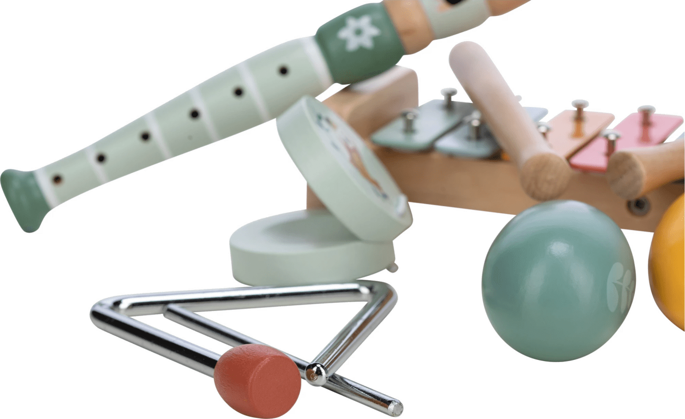 Komplet petih glasbil za vse male glasbenike. Prva glasbila otroku omogočajo spoznavanje novih zvokov in tonov. Lepo obarvan glasbeni set otroke privablja k raziskovanju le-teh.