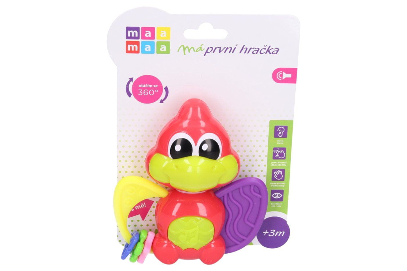 Maamaa Dino z učinki 12cm. Svetlobni in zvočni učinki s pritiskom na trebuh. Vključene baterije 3×AG13. Stikalo za vklop/izklop na dnu. 2 različici – zelena, rdeča.