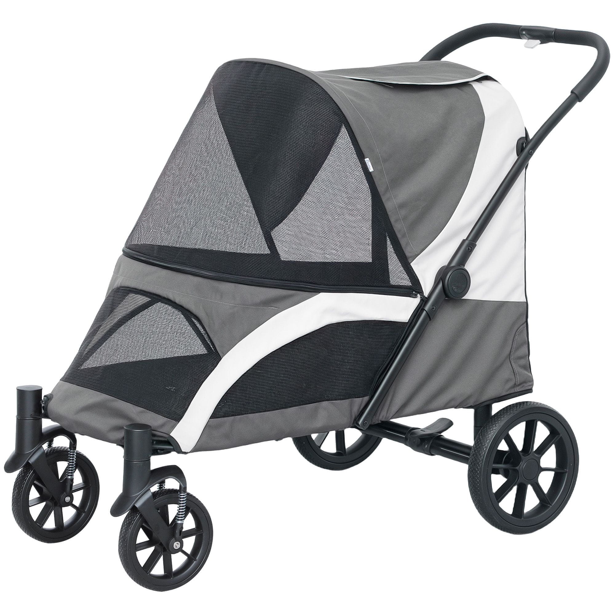 Ta zložljivi voziček za hišne ljubljenčke je zasnovan za udoben in priročen prevoz velikih psov in mačk med dejavnostmi na prostem. S svojo prostorno kabino kolesi z blaženjem tresljajev in več mrežastimi okni zagotavlja gladko in prijetno vožnjo za vašega ljubljenčka. Voziček ima enostavno zlaganje snemljiva kolesa in praktične možnosti shranjevanja zaradi česar je idealen za sprehode izlete ali obiske pri veterinarju.