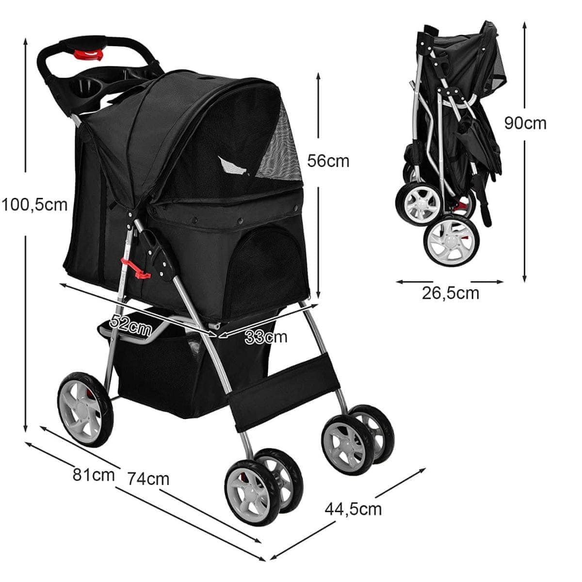 Zasnova vozička vključuje nastavljivo streho, ki vašega hišnega ljubljenčka ščiti pred težkimi vremenskimi razmerami, pa naj bo dež ali sonce. Velika košara za shranjevanje je popolna za prenašanje vseh potrebščin vašega hišnega ljubljenčka, kot so plastenke z vodo in priboljški, zaradi česar bodo vaši izleti brez težav. Mehanizem za hitro zlaganje otroškega vozička omogoča enostavno shranjevanje v vašem avtu ali doma in zavzame minimalno prostora.
