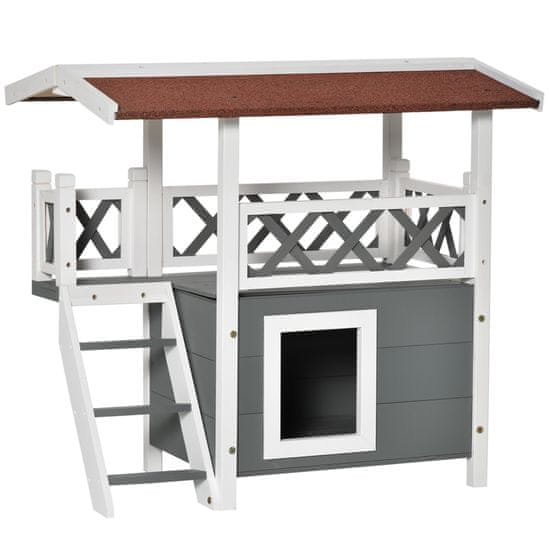 Zunanja mačja hiša PawHut je to, kar potrebujete želi razvajati vaše mačkone! Dvonadstropna zgradba zagotavlja udobno in ograjeno bivalno okolje, v katerem lahko varno in nemoteno počivajo, na zgornji terasi pa se lahko sprostijo in hkrati opazujejo okolico. Zunanja mačja koča je izdelana iz masivnega jelkinega lesa z vodoodporno barvo, zato bo služila dolgo časa.Vsebine: