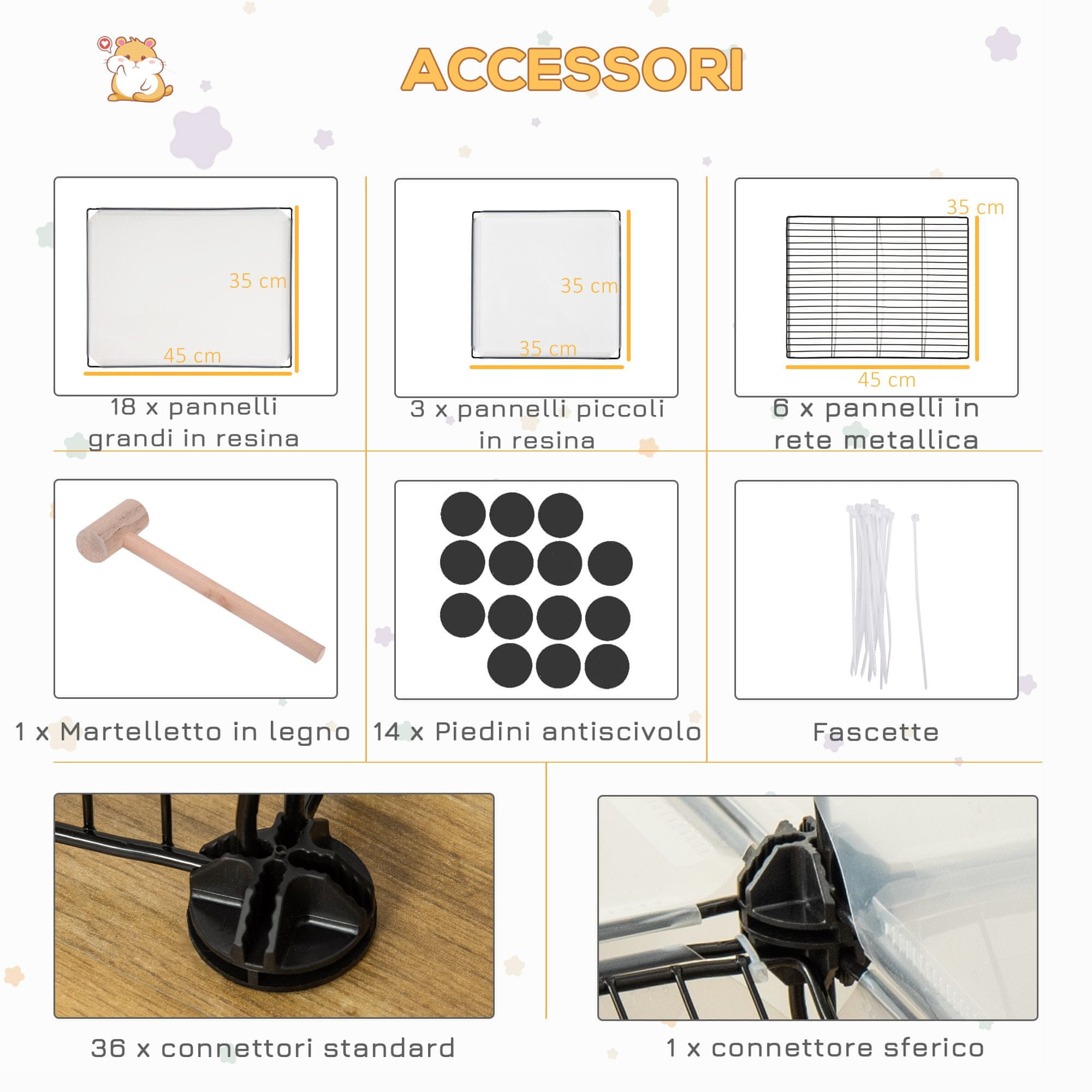 ZA MALE ŽIVALI: Ta ograja je idealna za zajce, činčile, ježke, morske prašičke in druge male živali. Zahvaljujoč panelom iz smole imaš odličen pregled nad notranjim delom ograje za živali, tako da imaš svoje male prijatelje vedno na očeh. OBLIKUJ SAM: To ograjo za živali lahko sestaviš v obliki, ki ti najbolj ustreza glede na tvoj prostor, in jo lahko hitro spremeniš. Na primer, lahko ustvariš dva ločena okolja ali zgradiš en velik boks, v katerem se bodo tvoji ljubljenčki lahko igrali. TRDNA KONSTRUKCIJA: Izdelana je iz visokokakovostnega kovine in PP smole, zato je ograja za hišne ljubljenčke trpežna in vzdržljiva skozi leta. Nogice proti zdrsu in sponke ti omogočajo, da ograjo stabilno postaviš in preprečiš padce. VSEBUJE DODATKE: Ograja za živali vključuje 6 panelov iz kovinske mreže, 18 velikih panelov iz smole, 3 majhne panele iz smole, 36 standardnih povezovalcev in 1 sferični povezovalec. Priloženi so tudi plastične sponke in lesen kladivo, ki ju lahko uporabiš za montažo ograje brez napora. DIMENZIJE: Skupne dimenzije: (standardna oblika): 140D x 70Š x 90V cm. Dimenzija panela iz smole: 45D x 35V cm (velika), 35D x 35V cm (majhna). Dimenzija panela iz kovinske mreže: 45D x 35V cm. Razdalja med žicami: 1,5 cm. Montaža je potrebna. Ta ograja za mladiče in male živali blagovne znamke PawHut je praktična rešitev za ohranjanje tvojih malih prijateljev v varnosti. Z enostavno in prilagodljivo zasnovo lahko panele sestaviš v želeno obliko in tako prilagodiš velikost boksa svojim prostorom. Priporočljiva je za zajce, činčile, morske prašičke in druge male živali. – 6 panelov iz kovinske mreže;