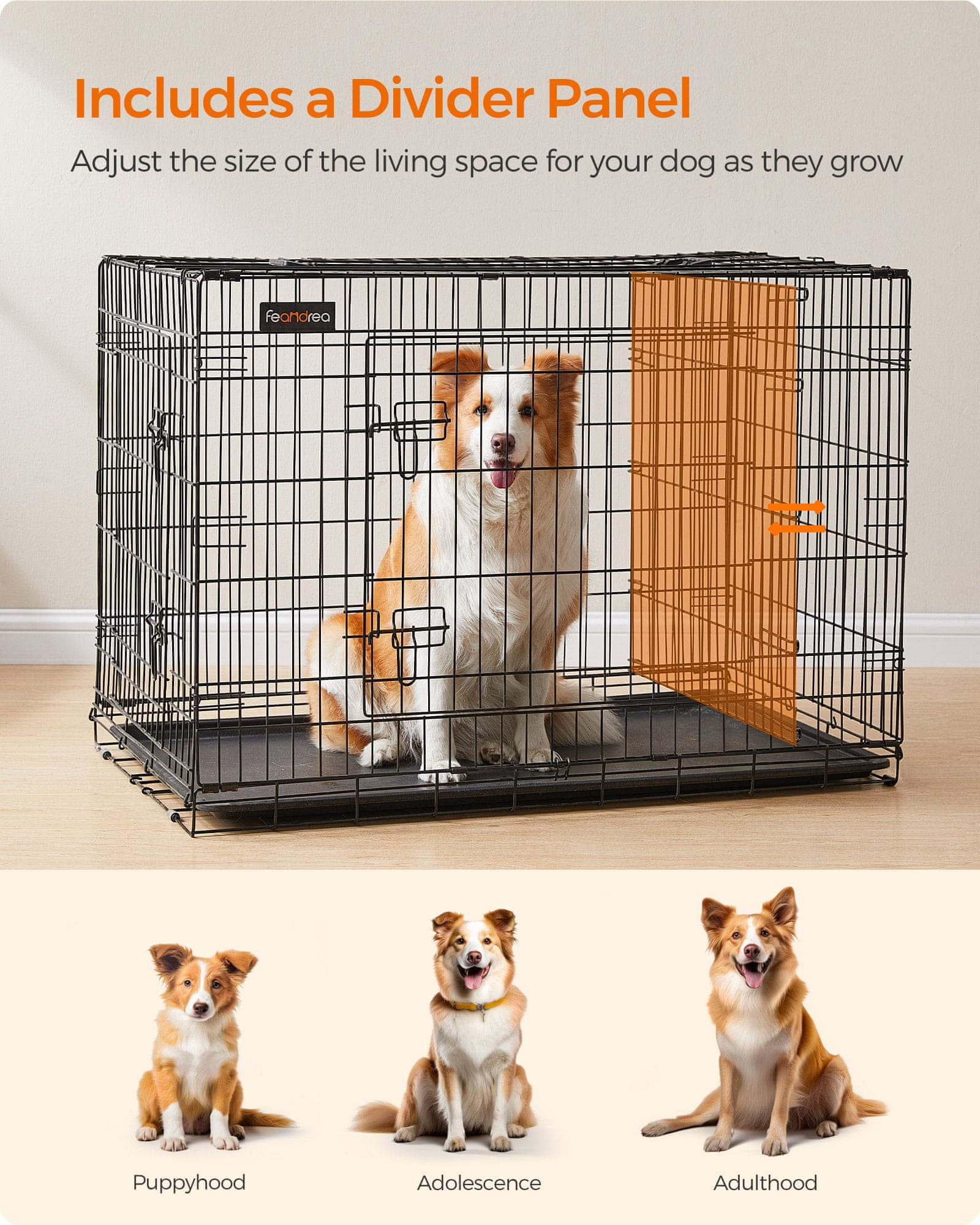 Ta žična pasja kletka nudi varen in udoben prostor za pse srednje velikosti z dvema vratoma za enostaven dostop in prilagodljivo uporabo. Zložljiva zasnova omogoča priročno shranjevanje in transport zato je idealna tako za dom kot za potovanja. Kletka vključuje zaščitne elemente za zaščito vaših tal in odstranljivo pregradno steno za različne možnosti postavitve. Material: Jeklo Dimenzije: 107×70×775cm Barva: črnačrna Odtenek barve: Črna Žival: Pes Dolžina (cm): 107 Višina (cm): 775 Material (podrobno): Kovina – jeklo Globina / širina (cm): 70