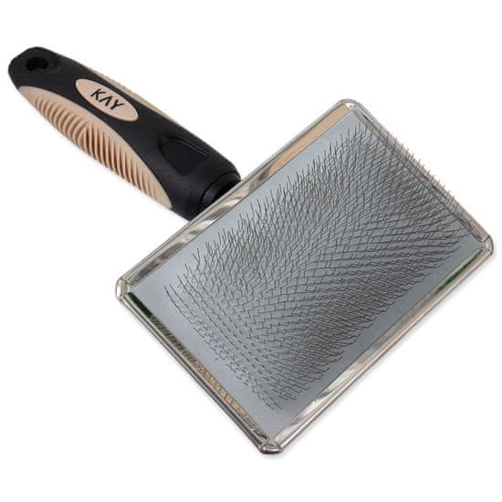Enostranska krtača za velike pse s prijetno oblikovanim plastičnim ročajem in finimi žičnatimi ščetinami.