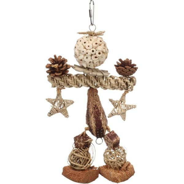 Naravna viseča igrača iz ratana, mahagonijevega stroka, kokosovega oreha, storžev, lesa sola in palmovih listov je primerna za različne vrste papig. Spodbuja mentalno aktivnost in naravno nego kljunov. Zaradi kovinskega sistema za obešanje jo je mogoče enostavno pritrditi v kletko ali voljero. Igrača vsebuje žogice, zvezdice, mahagonijev strok, spiralo, kokos in stožce, ki spodbujajo izraščanje zob. Uporabljeni materiali so naravni in varni za papige. Dimenzije (približno): 20 × 5,5 × 33 cm Material: Stročnice, mahagonijev strok, kokos, stožci, les sola, palmovi listi in kovina