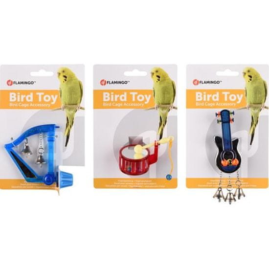 Tri vrste igrač v obliki glasbil – harfa, boben in kitara z ogledalom in zvončki. Primerne za angele in druge majhne papige. Dimenzije: ± 8 cm