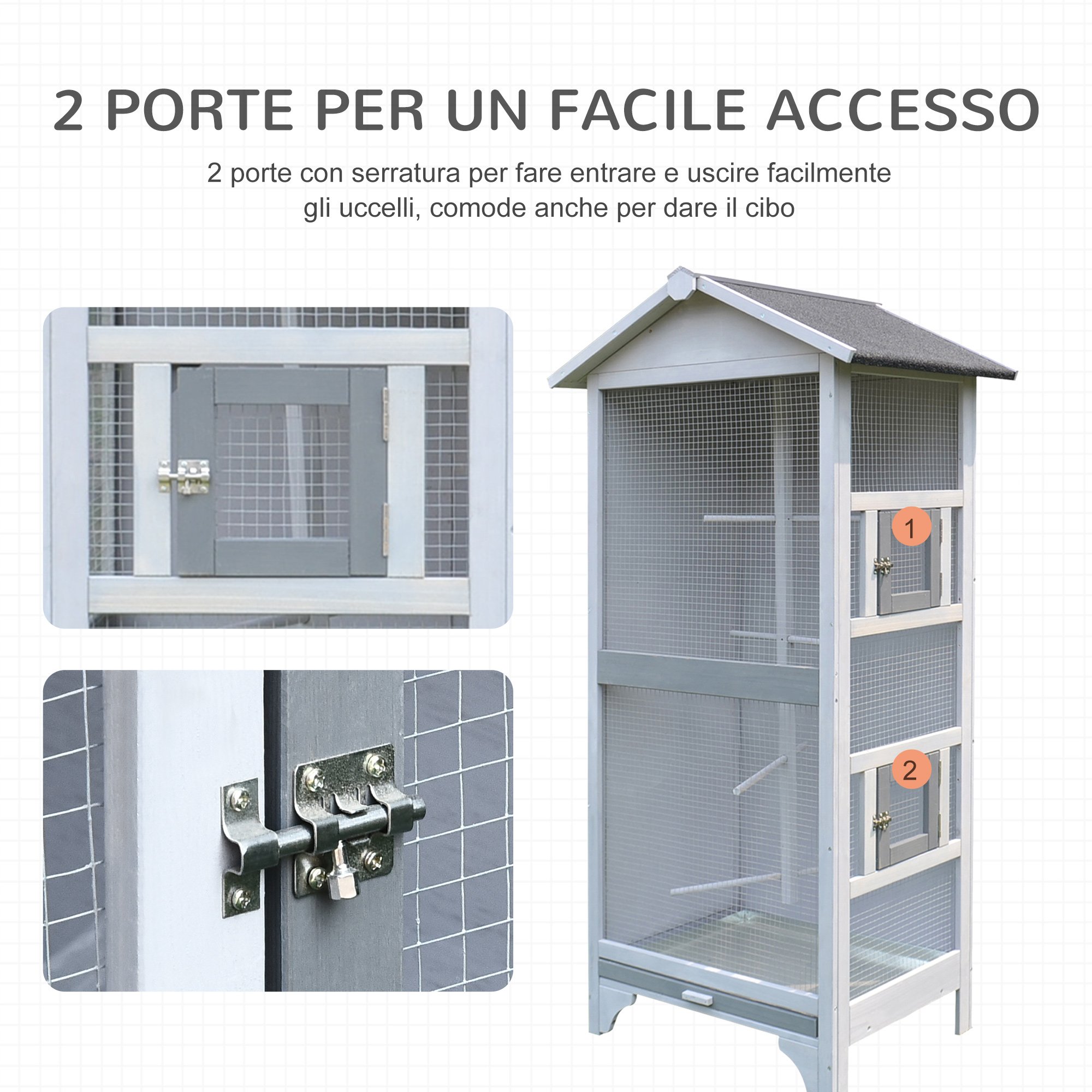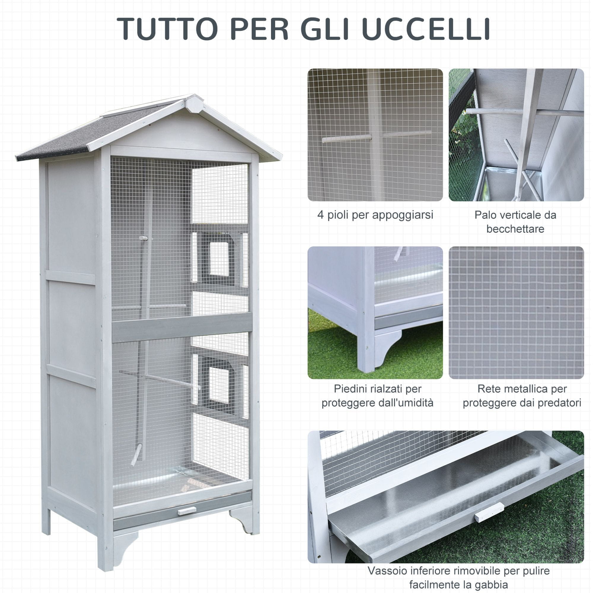 Kompaktna pokončna zasnova za več ptic Mreža za zaščito pred plenilci Narejena iz trdnega jelkinega lesa, odpornega na vremenske vplive Kletka ima 2 odprtini z varnostno ključavnico. Asfaltna streha za zaščito pred vremenskimi vplivi Odstranljiv spodnji pladenj za enostavno čiščenje 4 gredice za počitek ptic Volija ni primerna za agresivne ptice