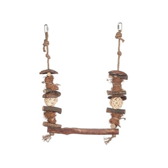 Viseča gugalnica za majhne in srednje velike papige je izdelana iz topolovega lesa, kokosove lupine, kokosovih vlaken, pletenih kroglic in vrvi iz jute. Spodbuja občutek za ravnotežje, plezanje in naravno gibanje. Primeren je tako za aktivno igro kot za počitek. Zahvaljujoč dvema kovinskima karabinoma ga je mogoče preprosto obesiti v kletko ali voljero. Narejen je iz trpežnih in varnih naravnih materialov. Dimenzije (približno): 45 × 30 cm Material: Material: les topola, juta, kokos, protja, kovina
