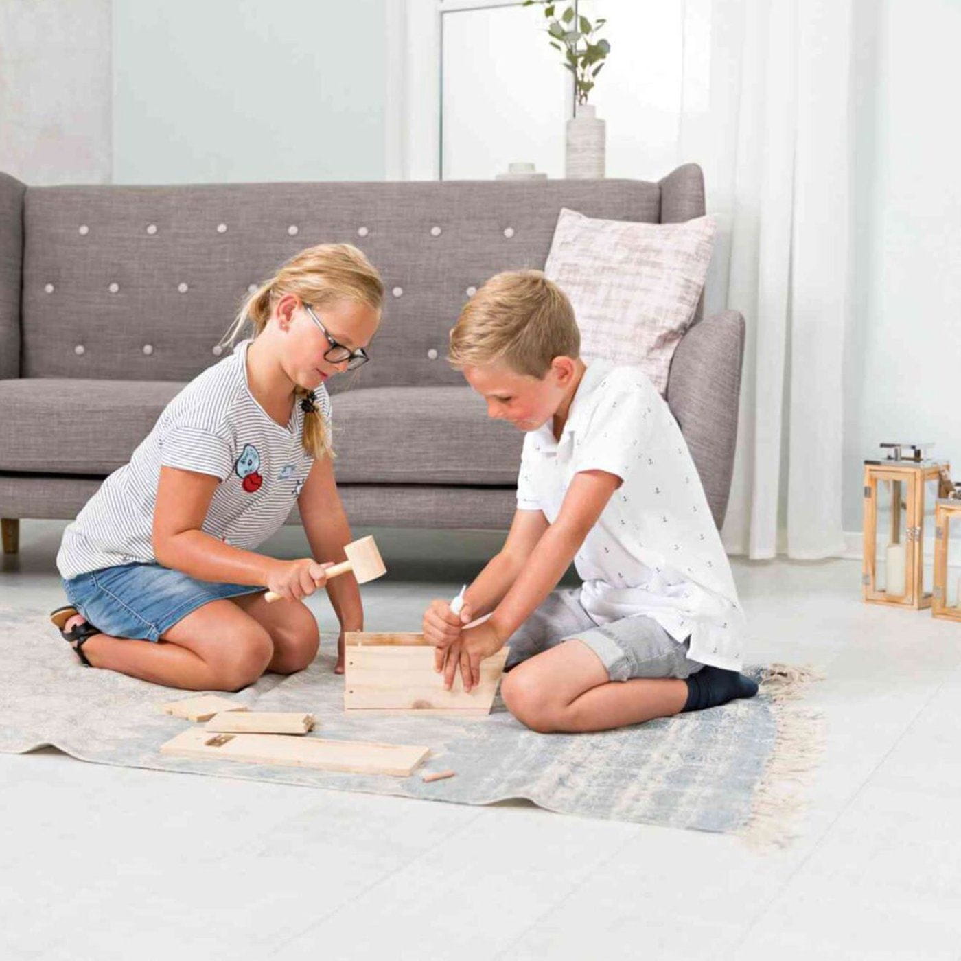 • Paket vključuje tudi ilustrirana navodila za sestavljanje in leseno kladivo.
