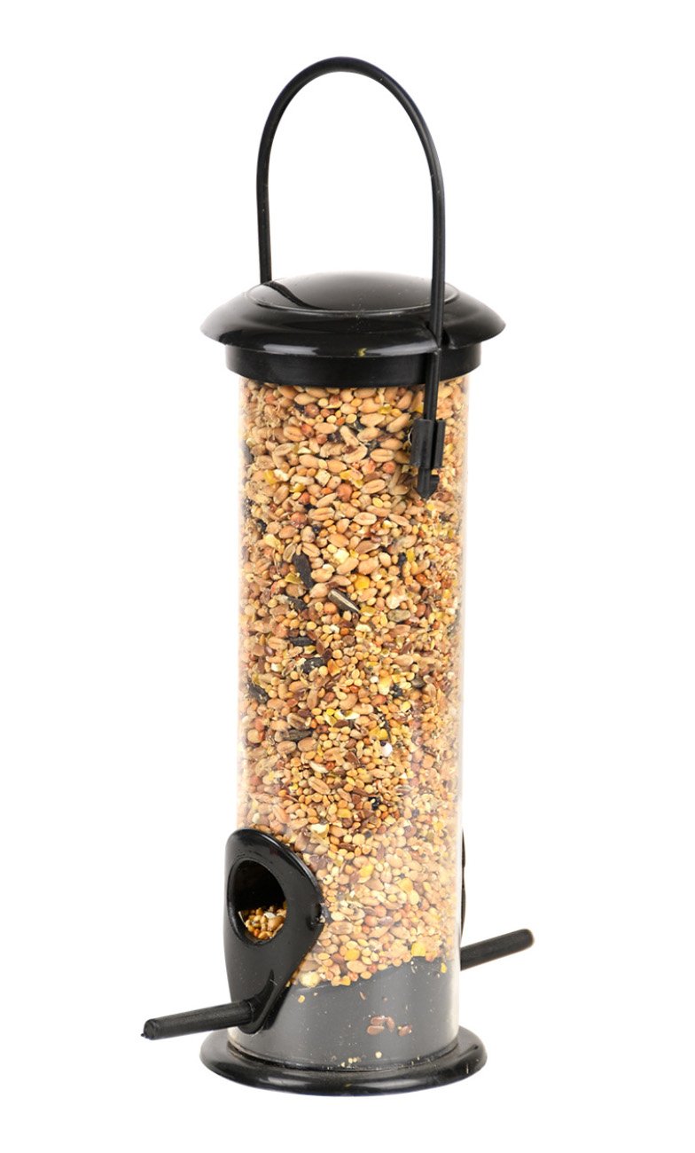 Z lahkoto se polni Vsebina je zaščitena pred vetrom in vlago ter ptičjimi iztrebki Priljubljena in praktična krmilnica Z dvema luknjama in gredi Luknjice so zasnovane tako, da so semena lahko dostopna, vendar ne padejo ven. Celoten opis