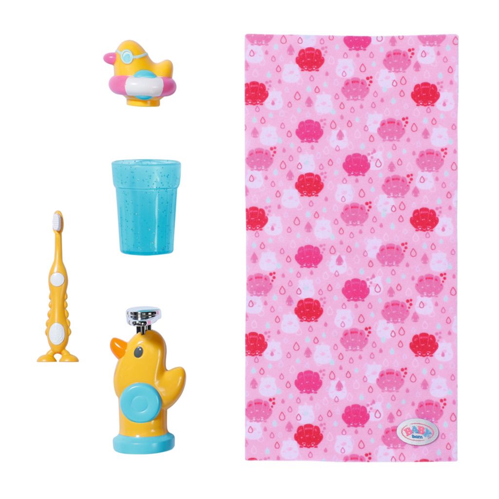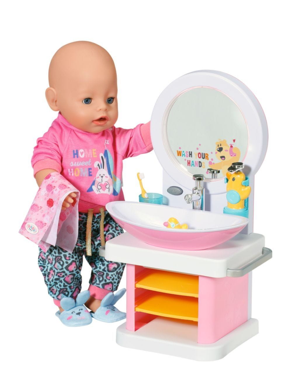 BABY born Umivalnik s svetlobnimi in zvočnimi učinki. Vključuje zobno ščetko, skodelico, razpršilnik za milo, čep v obliki račke in brisačo.