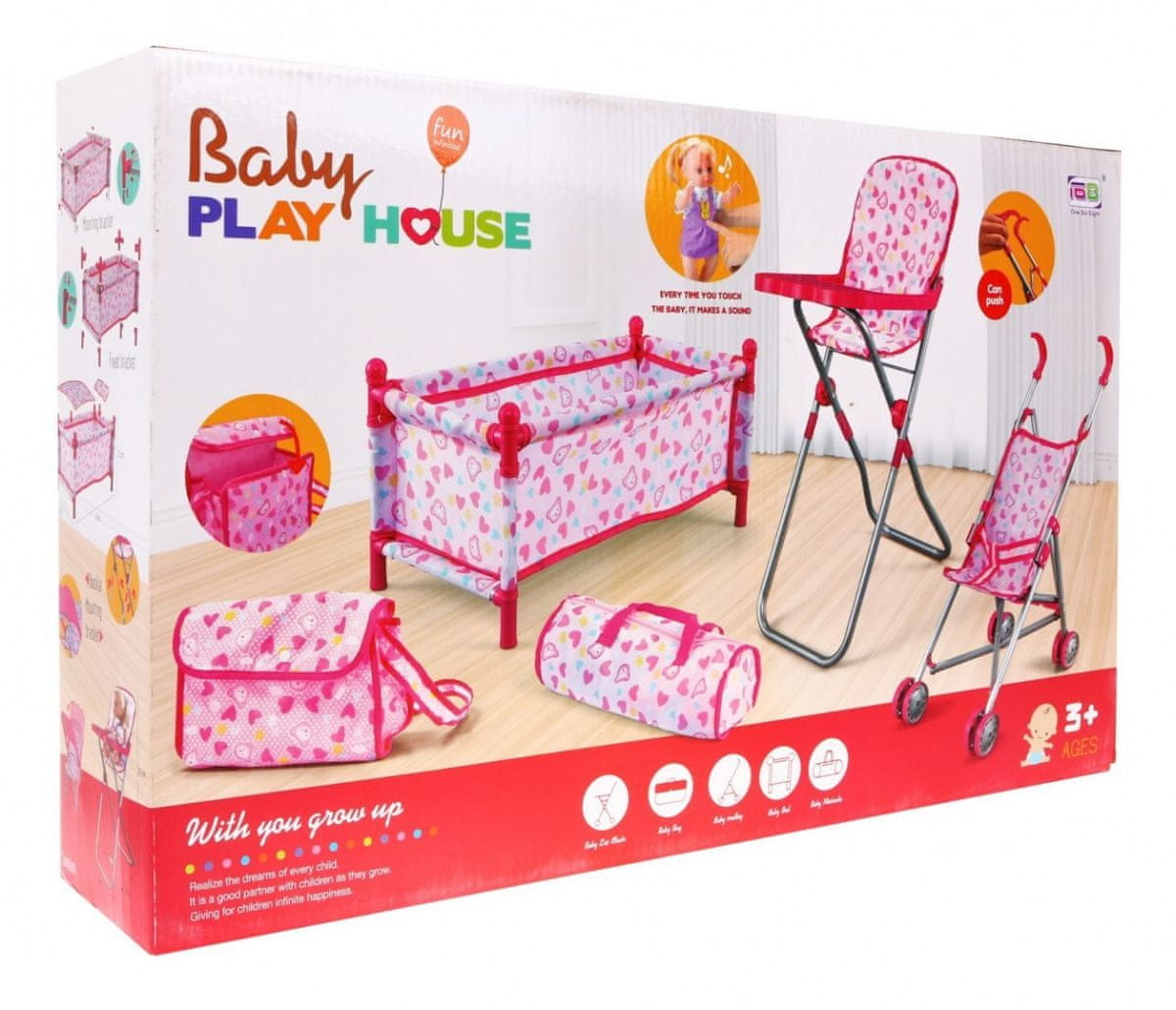 Elementi kompleta so lahki, stabilni in prilagojeni majhnim otroškim rokam. Punčka bo imela svoj prostor za počitek, hranjenje in sprehode, dodatni torbici pa poskrbita za shranjevanje pripomočkov. Set spodbuja domišljijo, razvija socialne veščine, nežnost ter ročne spretnosti otrok. Igrača je primerna za otroke od 3. leta starosti in je odlična izbira za darilo.