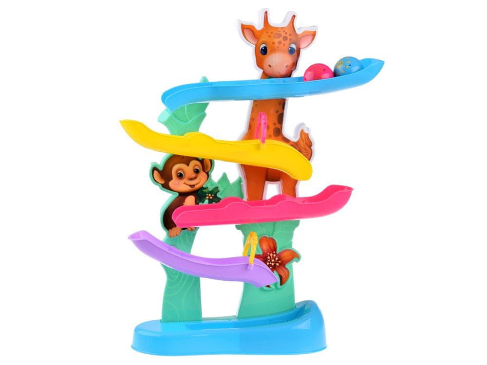 Igrača ima 4 barvite klančine po katerih se kotali rožnato-modra žogica, in ko doseže dno, bo vaš otrok slišal vesele zvoke živali iz džungle skupaj z igrivim zvokom bobnov. Ta interaktivna igrača spodbuja vašega dojenčka k razvoju koordinacije rok in oči ter motoričnih sposobnosti skozi igro! Vaš otrok se lahko ure in ure zabava ob opazovanju kotaljenja žogic. Zahvaljujoč barvitim poudarkom in zvočnim učinkom bo žogična steza vašega otroka zabavala kadar koli.