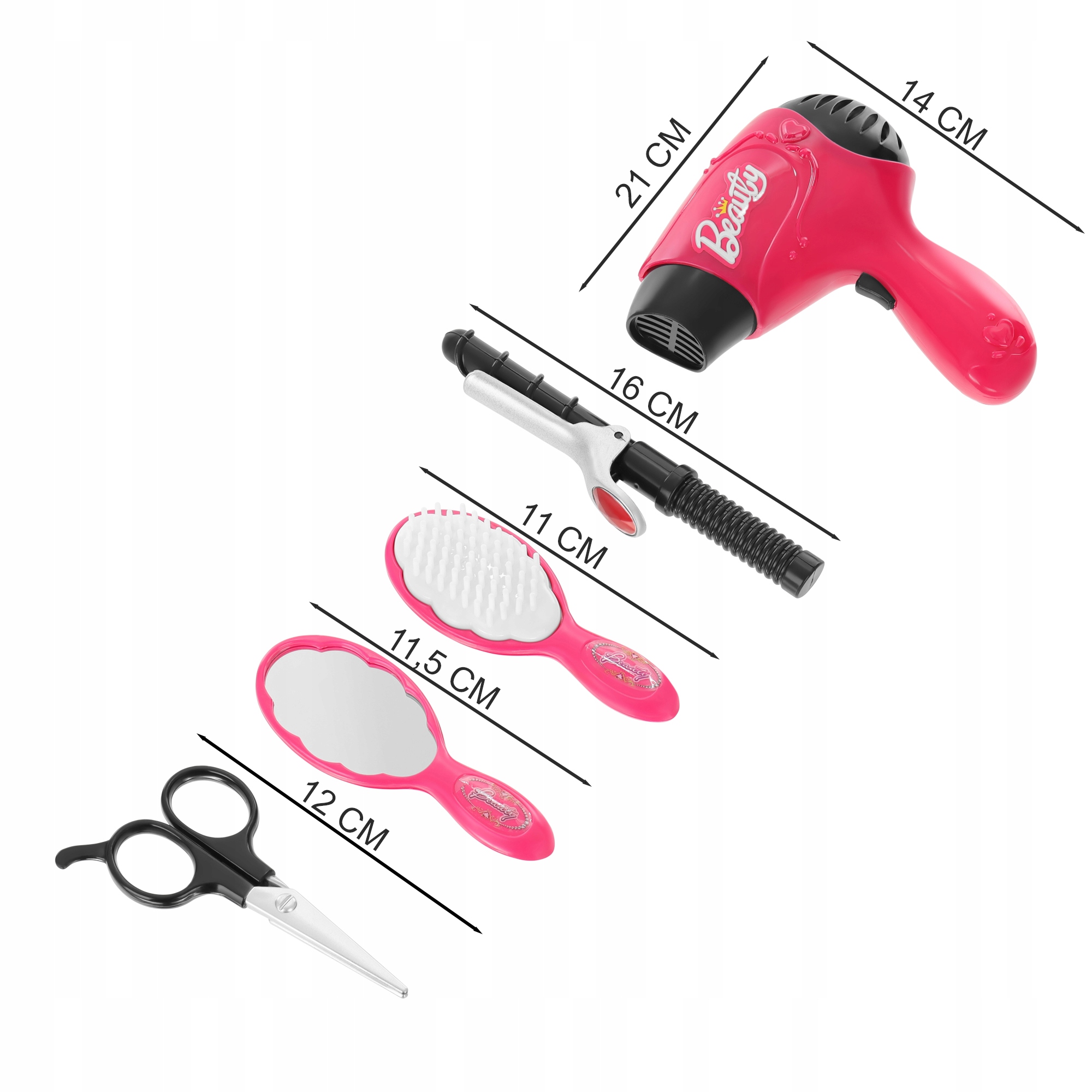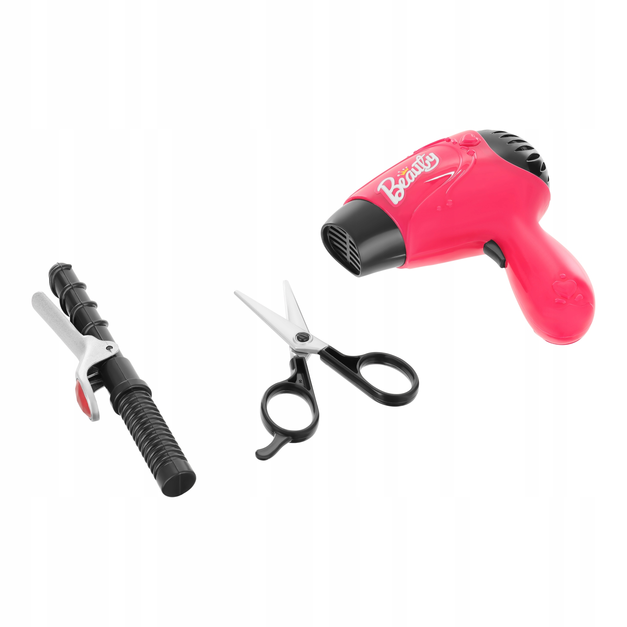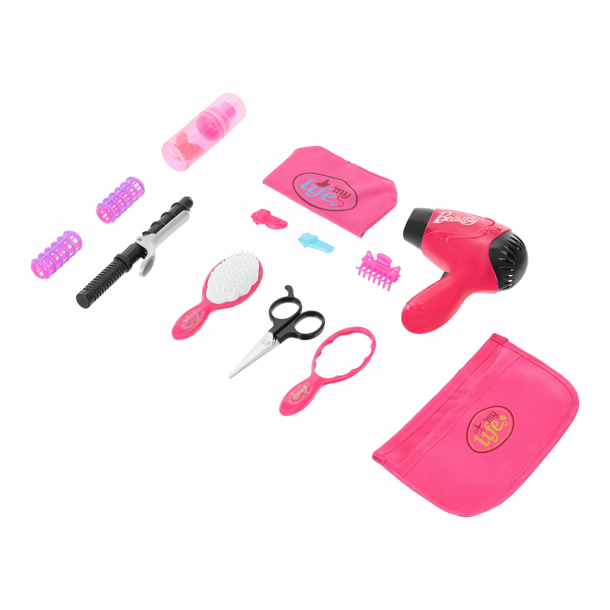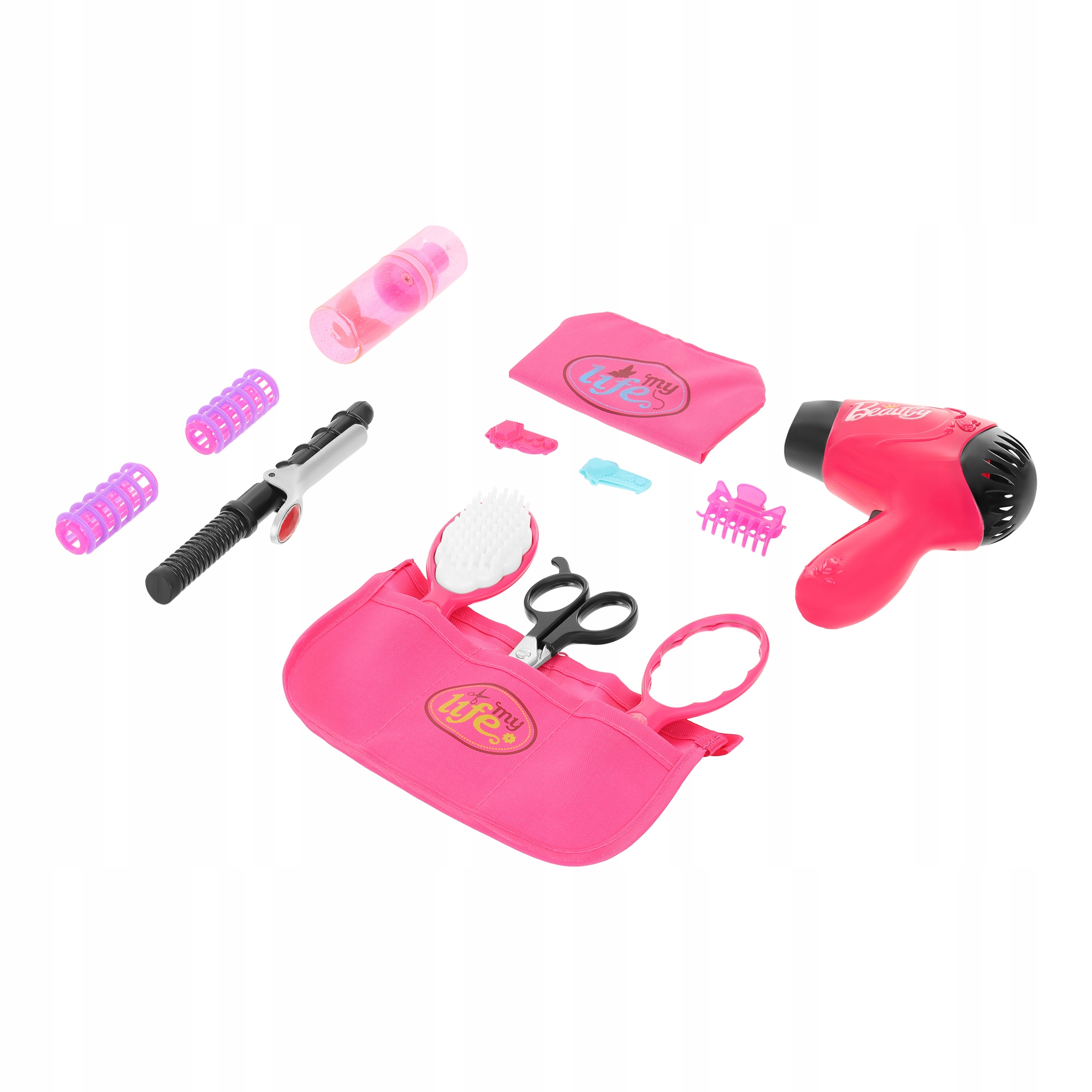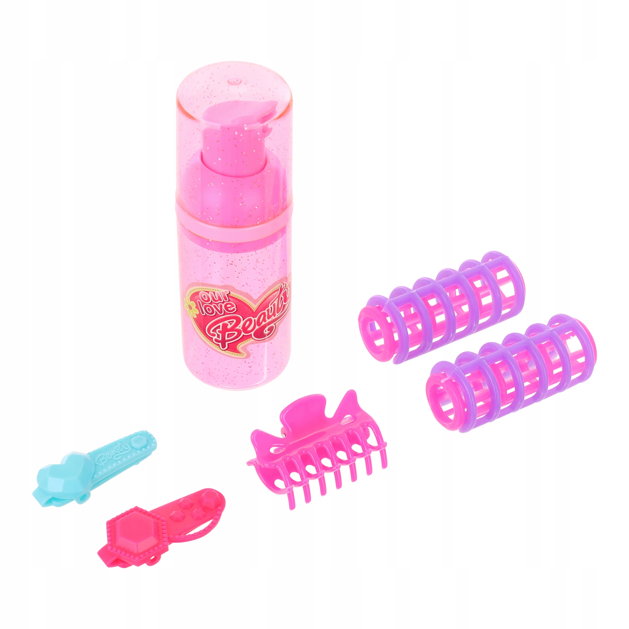 Dodatki se odlikujejo po intenzivni, dekliški roza barvi. Zagotovo bo všeč vsaki majhni princeski, ki se želi spremeniti v najboljšo frizerko naokoli.