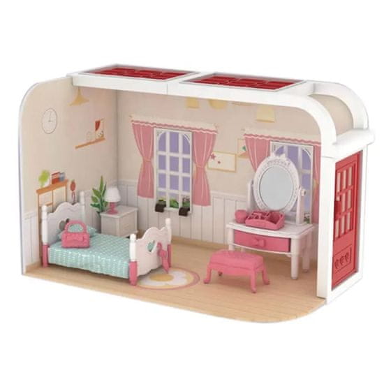 • Materiali: les (vezane plošče – stene), plastika (pohištvo, streha, stranske stene, okna), papir (tapete)