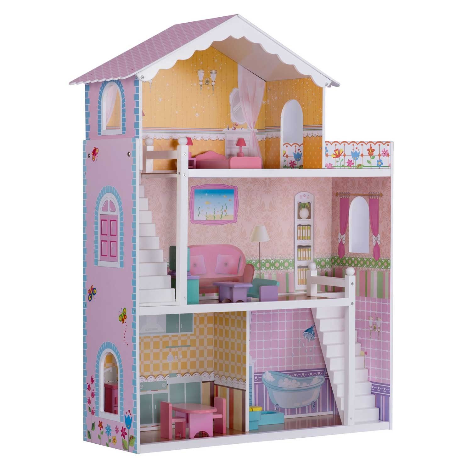 shumee Velika 3-nadstropna lesena hišica za punčke + pohištvo + terasa