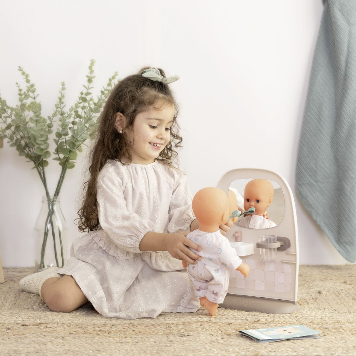 Kopalnica za lutke iz serije Baby Nurse. Vključuje stranišče, rolo toaletnega papirja, umivalnik, ogledalo, zobno ščetko in skodelico. Lutka ni vključena. Dimenzije nepakiranega izdelka: 25 × 34 × 22,20 cm.