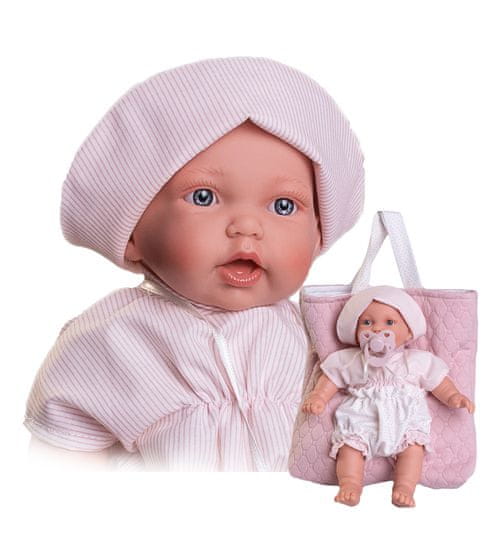 Govoreča, ročno izdelana realistična španska lutka. Ko jo pritisnete na trebušček, začne govoriti „mama“, „papa“ in proizvaja realističen zvok smejočega se dojenčka. Lutka ima telo iz mehke tkanine, glava in okončine pa so izdelane iz visokokakovostnega mehkega vinila. Oblačila nekaterih lutk so bila izdelana iz organskega bombaža, ki zagotavlja pridelavo ročno nabranega, ekološko pridelanega bombaža brez kemične obdelave. Podjetje Antonio Juan daje velik poudarek ekologiji in je zato prvo, ki v industriji uporablja omenjeni bombaž. Velikost 27 cm. Pakirano v darilni škatli. Priporočena starost od 2. leta dalje. Vključuje 3 baterije LR44 z navodili za zamenjavo. Baterije so potrošni material, zato pomanjkanje baterij ni razlog za reklamacijo lutke.